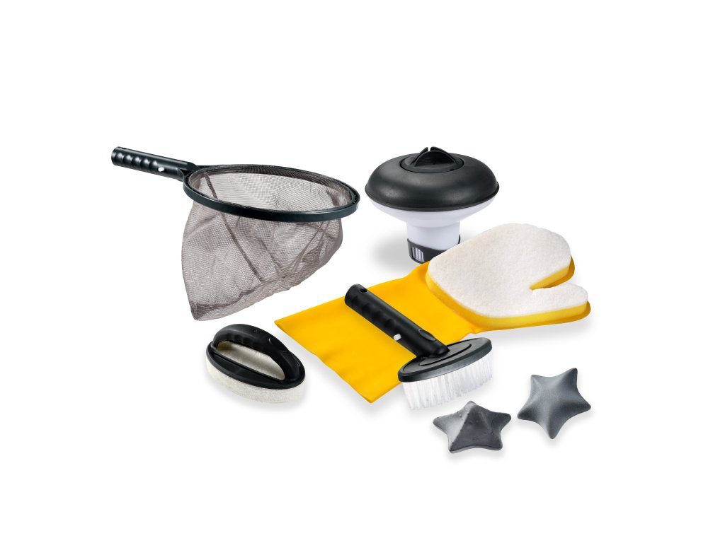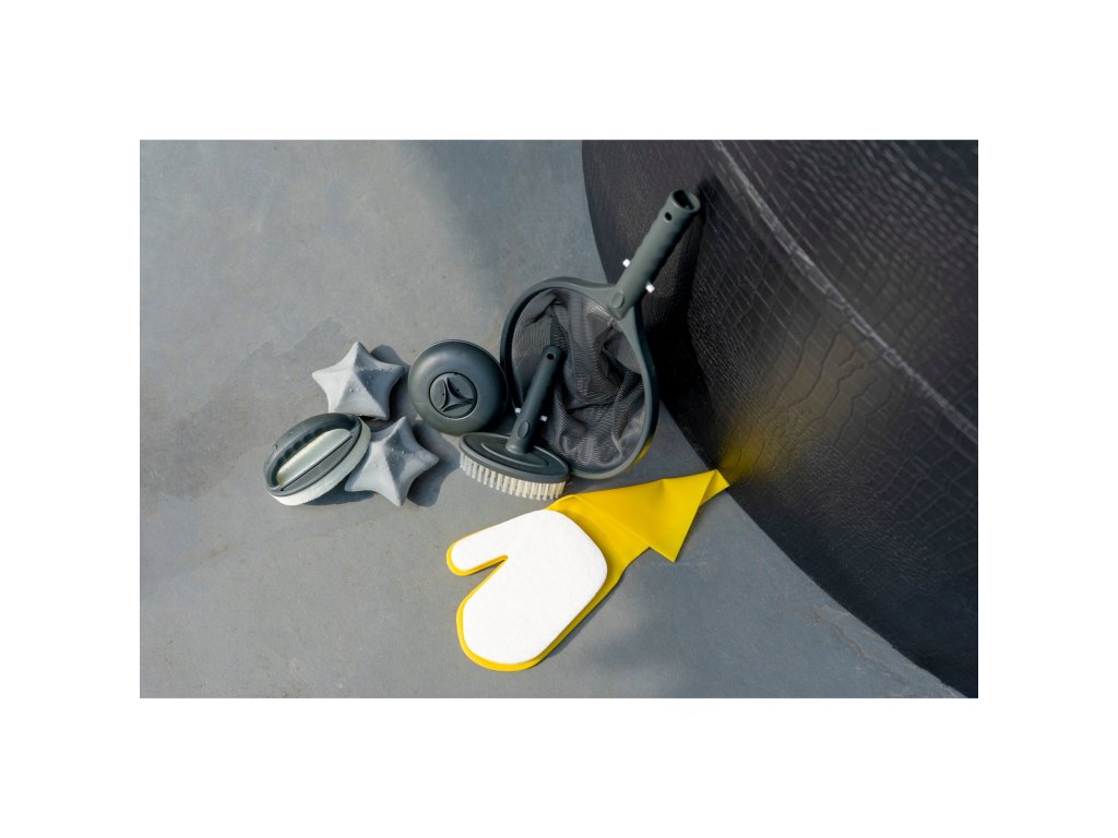 Sada pro údržbu vířivky se skládá z dokonalého čistícího příslušenství pro vaší vířivku. Sada se skládá z rukavice s houbou, kartáče, naběráku, dvou čistících hub a dávkovače chlóru. Díky této čistící soupravě udržujte svou vířivku čistou, abyste zabránili usazování bakterií a řas ve vodě.