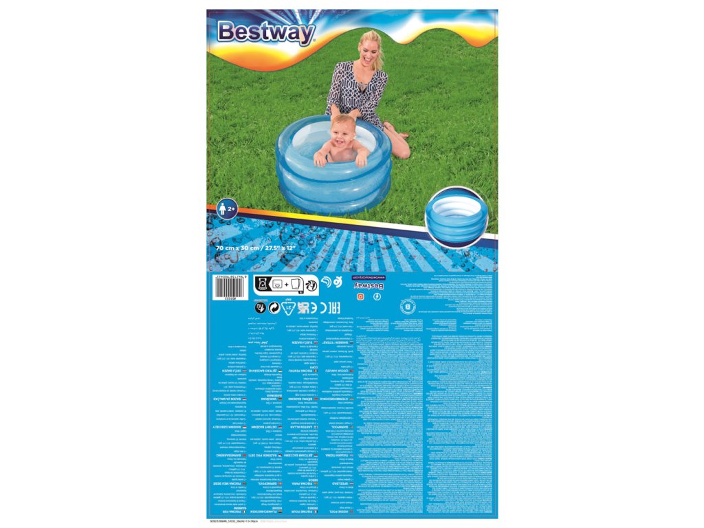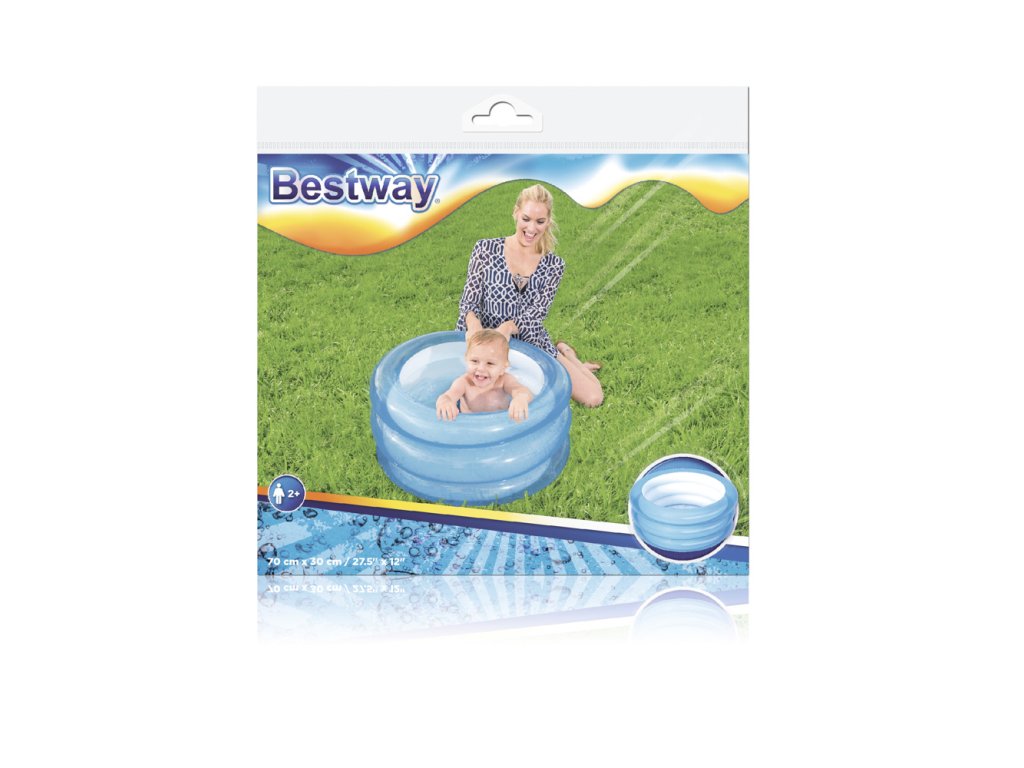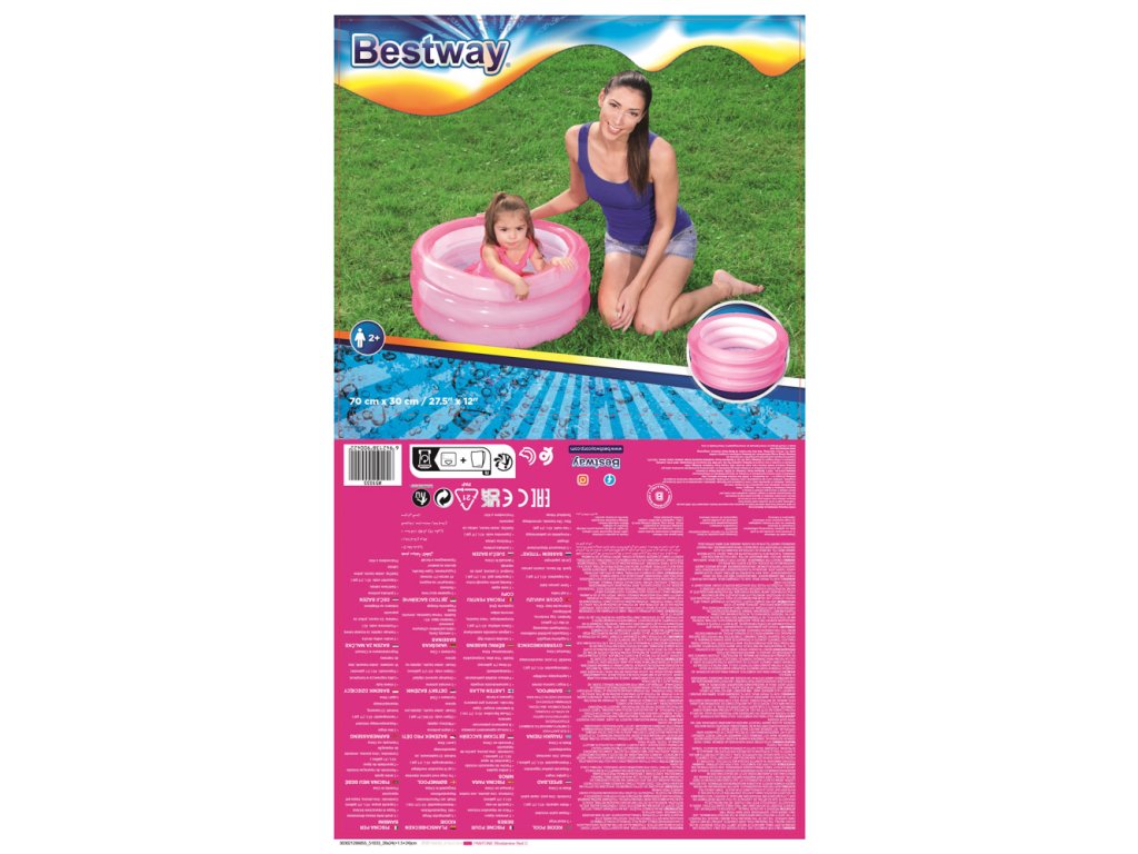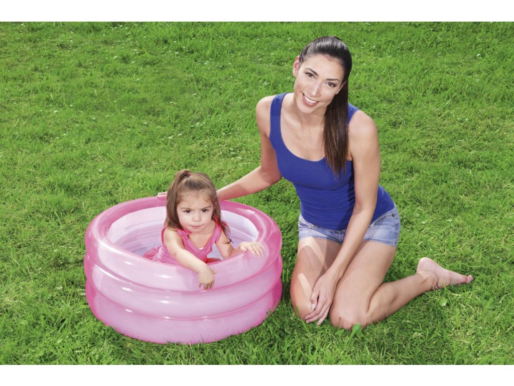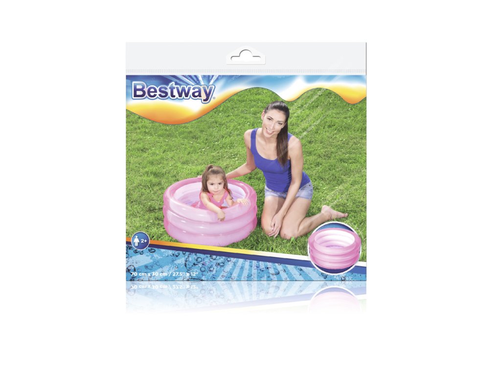 Dětský nafukovací bazének Bestway v růžové či modré variantě provedení je ideální pro osvěžení malých dětí. Skládá se ze 3 stejných kruhů, které jsou vhodné také jako opěra dětí. Bazének má pohodlnou, měkkou, nafukovací podlahu. Vyrobeno z bezpečného a odolného vinylu. Bezpečnostní ventily. Obsahuje: 1 nafukovací bazének, 1 opravná sada. Max. kapacita: 43 l. Rozměr: 70 x 30 cm. Věk: 2+. Užívání vždy pod dohledem dospělé osoby.