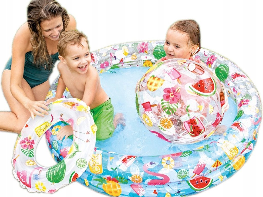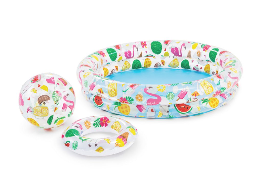 Veselá nafukovací sada se skládá z bazénu, který tvoří 2 vzduchové komory a jeho rozměr je 122 x 25 cm. Součástí je také plavací kruh a míč v průměru 51 cm. Výrobky jsou vyrobeny z kvalitního PVC materiálu.