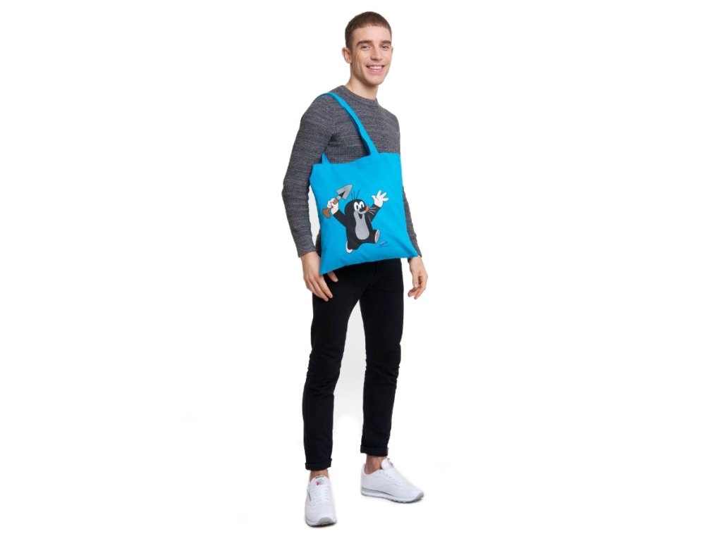 Bavlněná nákupní taška s motivem Krtečka, který drží lopatku. Taška je tyrkysové barvy, má dlouhá ucha pro pohodlné nošení. Praktická a ekologická na každodenní nákupy.