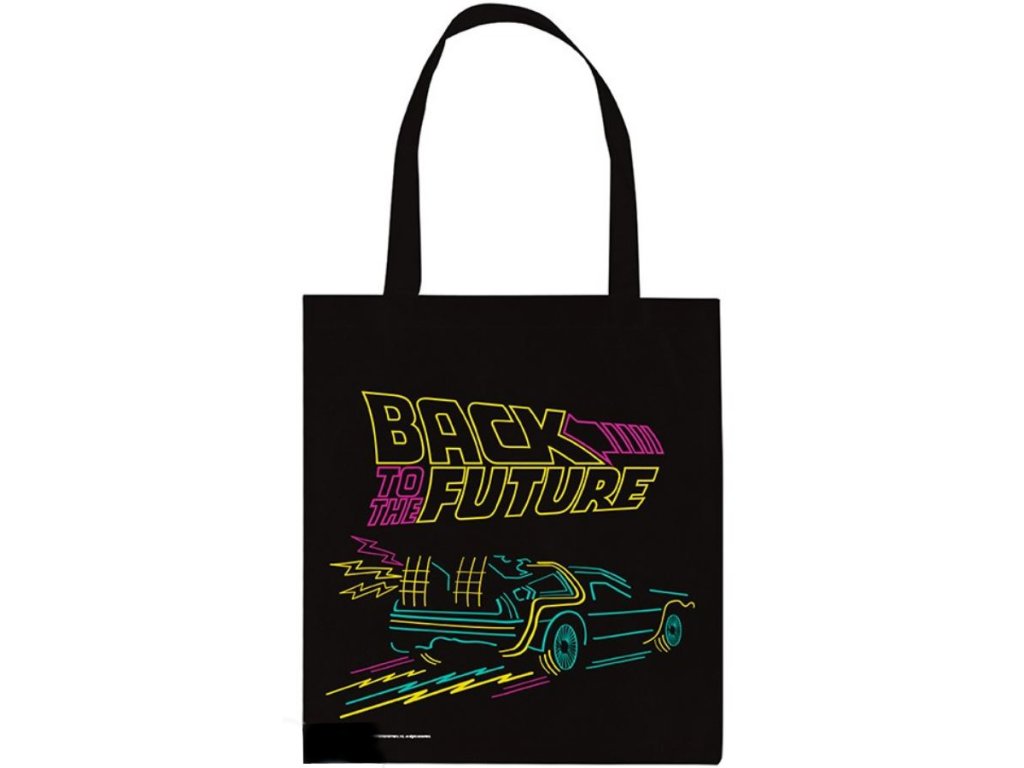 Černá shopping taška se 2 uchy s neonovým efektem Návrat do budoucnosti. Potištěno ekologickými inkousty a z udržitelných zdrojů.