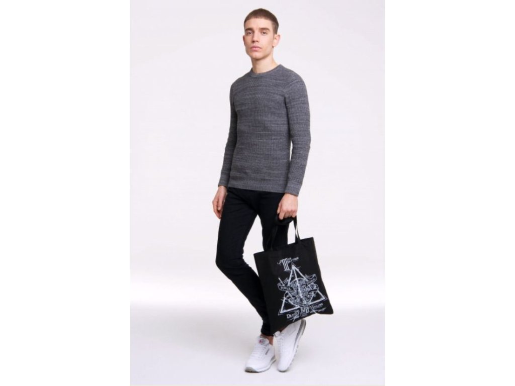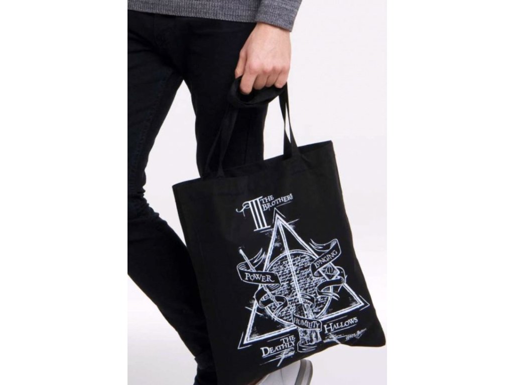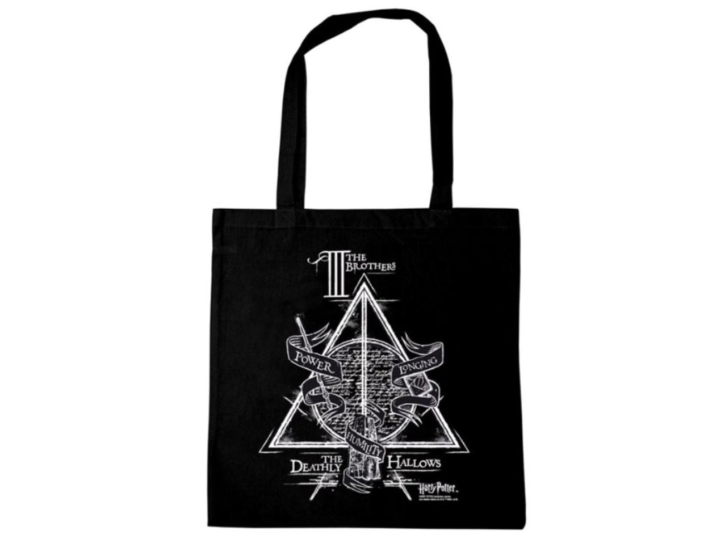 Praktická černá a jednoprostorová nákupní taška s bílým znakem Relikvie smrti, z filmové sci-fi ságy Harry Potter.