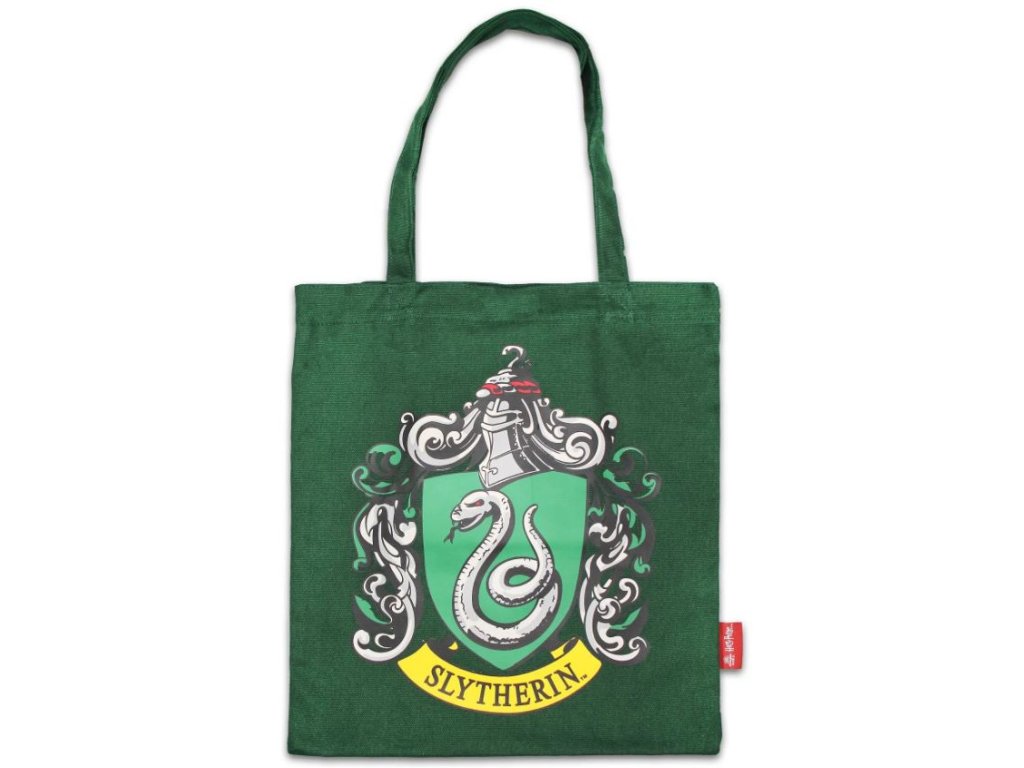 Zelená shopping taška na rameno vyvedená v motivu bradavické koleje Zmijozel.