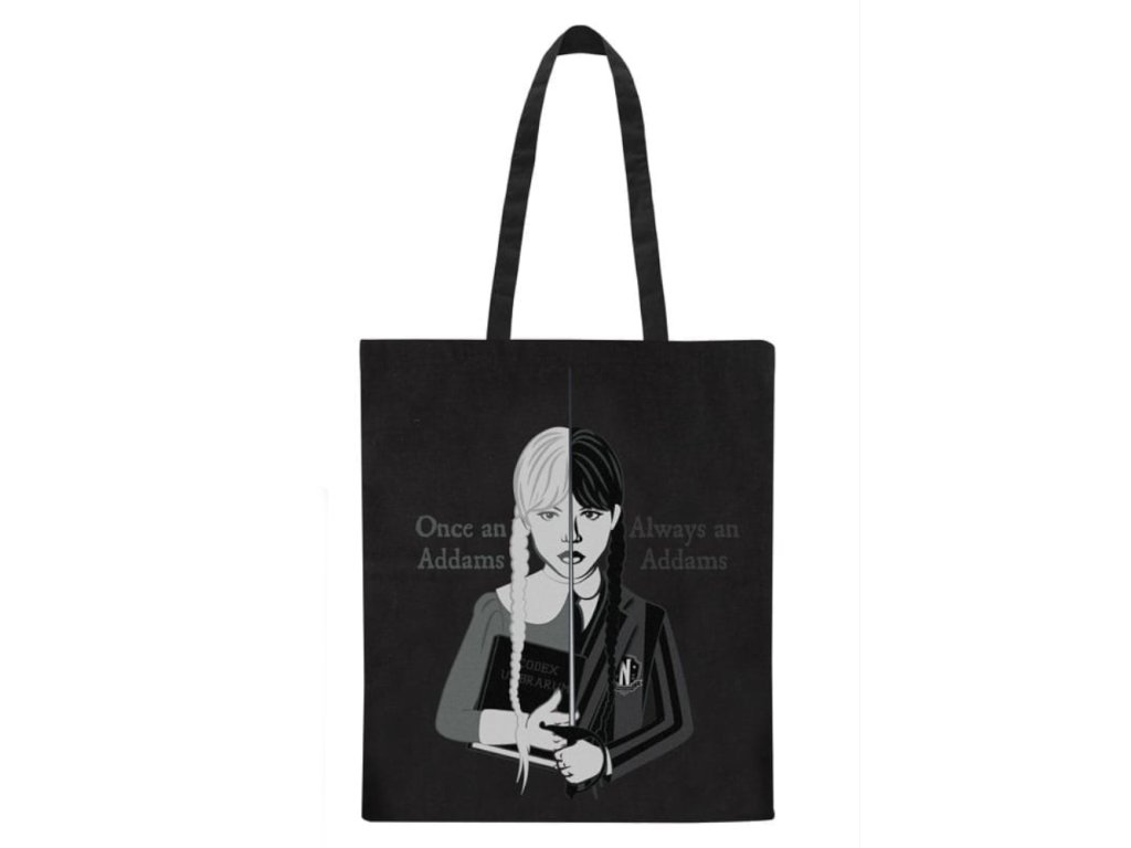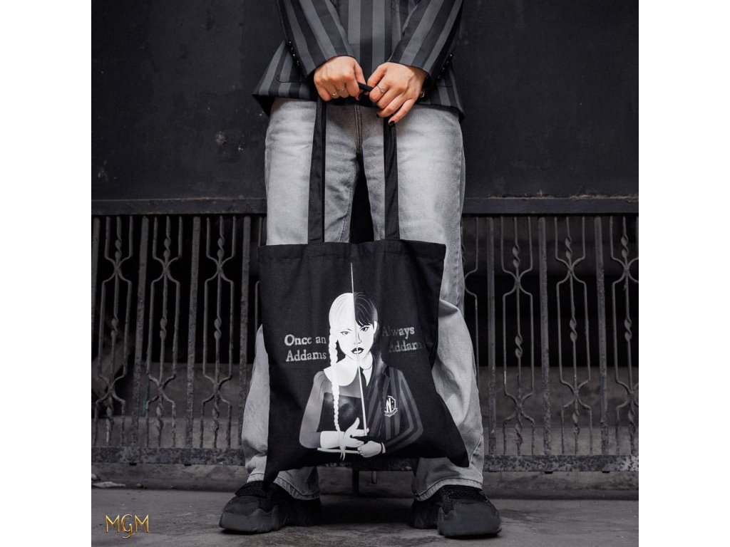 Černá shopping taška s grafikou hlavní hrdinky celého stejnojmenného seriálu Wednesday. Taška je vhodná nejen na nákupy pro každého správného fanouška.
