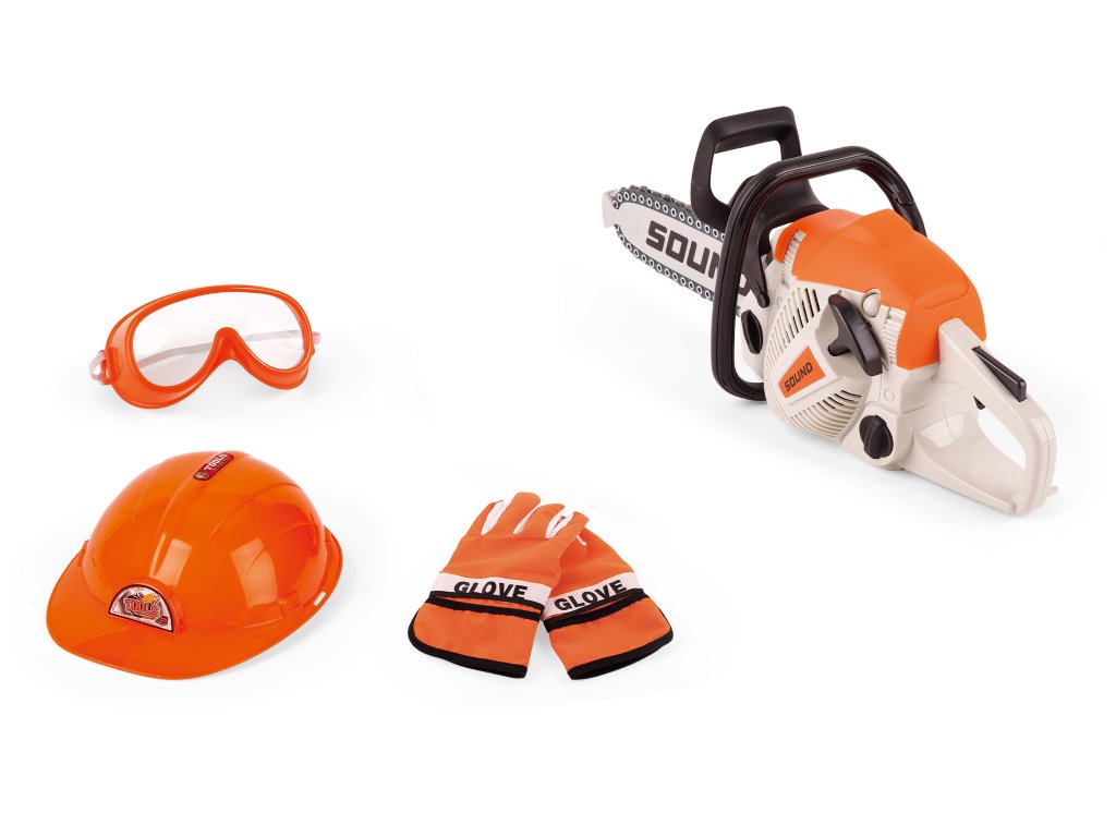 Motorová pila 35cm. baterie 3xAA nejsou součástí. Obsahuje motorovou pilu, helmu, rukavice a brýle. zvukové efekty