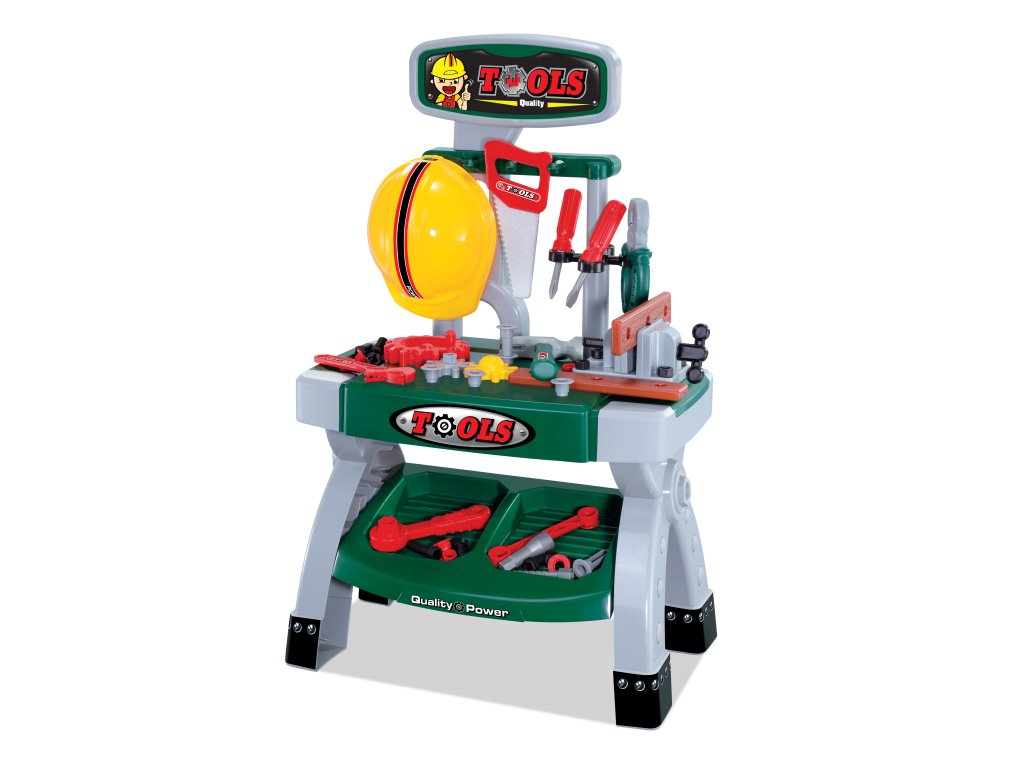 Stolek s nářadím. Rozměry 44 x 28 x 71 cm. Součástí stolek, helma, šrouby, matice, ozubená kola, kleště, kladivo, klíče, pilka, kombinačky, šroubováky, svěrák.