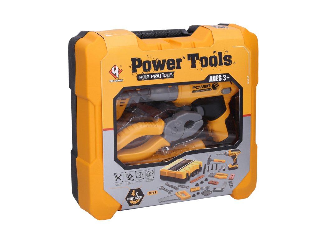 Nářadí v kufříku. Rozměry kufříku 26x9x25,5 cm. Světelné efekty. 3xAAA do vrtačky nejsou součástí. Přepínač ON/OFF na vrtačce. Součástí kufřík, vrtačka s náhradními šroubováky, kladivo, kombinačky, pilka, šroubovák, 2 klíče, pravítko, dřívka, šrouby, matice a další.