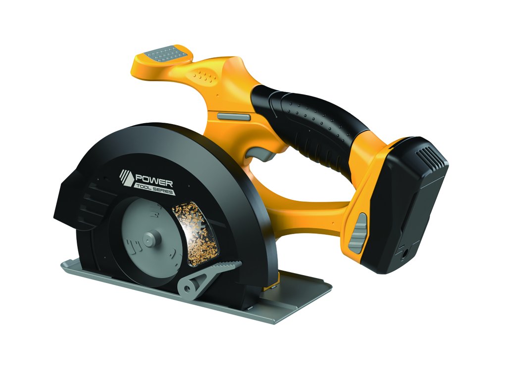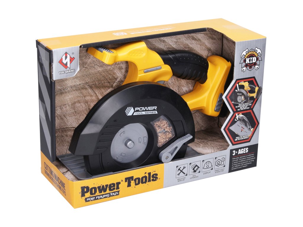 Okružní pila. Rozměry 31x12x20,5 cm. Světelné efekty. 3xAAA baterie nejsou součástí. Aktivace spouští nebo přiložením na rovnou plochu.