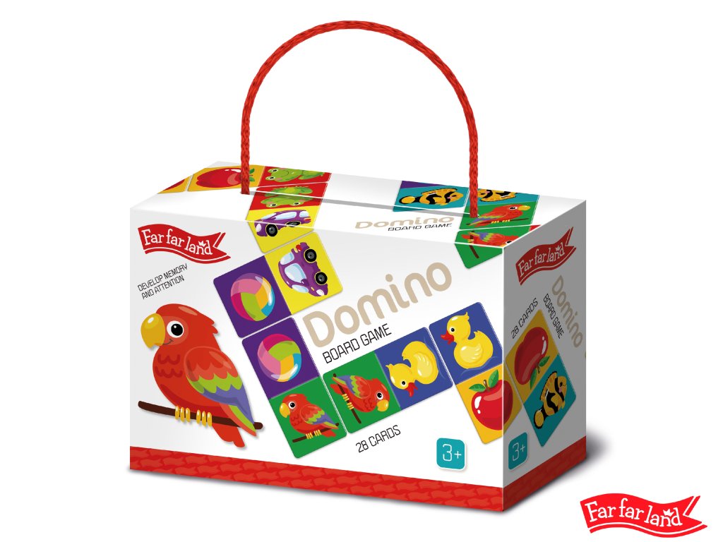 Far Far Land Domino barevné s obrázky. Balení obsahuje 28 karet. Hra pro 2-5 hráčů. Při hře 2 hráčů každý hráč dostane 7 karet. Při hře více hráčů každý dostane 5 karet. Zbývající karty jsou v "banku.“ Hráč, který má "dvojitou" kartu (kartu s totožnými obrázky), hraje první. Pokud žádný z hráčů nemá dvojitou kartu, každý hráč si vezme jednu kartu z banku. Pokud má více hráčů dvojitou kartu, začíná ten mladší. Pro rozehrání prvního tahu si však můžete vymyslet svá vlastní pravidla. Hráči se střídají a jeden za druhým přikládají karty ze své ruky ke kartám na hrací ploše se shodným obrázkem. Pokud hráč nemá shodný obrázek, musí si vzít kartu z banku. Hráč, který položí svou poslední kartu na hrací plochu, vyhrává. Pokud všichni hráči mají v ruce karty, ale není možné hrát dál, hra je ukončena "blokem" a vyhrává hráč, který má v ruce nejmenší množství karet.