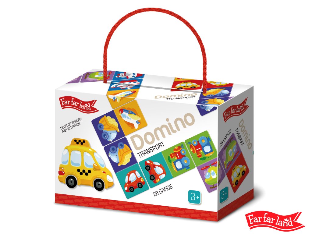 ar Far Land Domino s obrázky doprava. Balení obsahuje 28 karet. Hra pro 2-5 hráčů. Při hře 2 hráčů každý hráč dostane 7 karet. Při hře více hráčů každý dostane 5 karet. Zbývající karty jsou v "banku.“ Hráč, který má "dvojitou" kartu (kartu s totožnými obrázky), hraje první. Pokud žádný z hráčů nemá dvojitou kartu, každý hráč si vezme jednu kartu z banku. Pokud má více hráčů dvojitou kartu, začíná ten mladší. Pro rozehrání prvního tahu si však můžete vymyslet svá vlastní pravidla. Hráči se střídají a jeden za druhým přikládají karty ze své ruky ke kartám na hrací ploše se shodným obrázkem. Pokud hráč nemá shodný obrázek, musí si vzít kartu z banku. Hráč, který položí svou poslední kartu na hrací plochu, vyhrává. Pokud všichni hráči mají v ruce karty, ale není možné hrát dál, hra je ukončena "blokem" a vyhrává hráč, který má v ruce nejmenší množství karet.