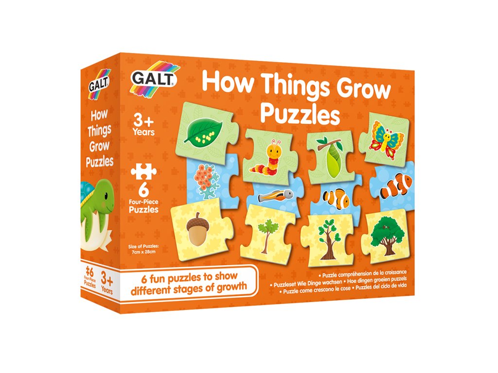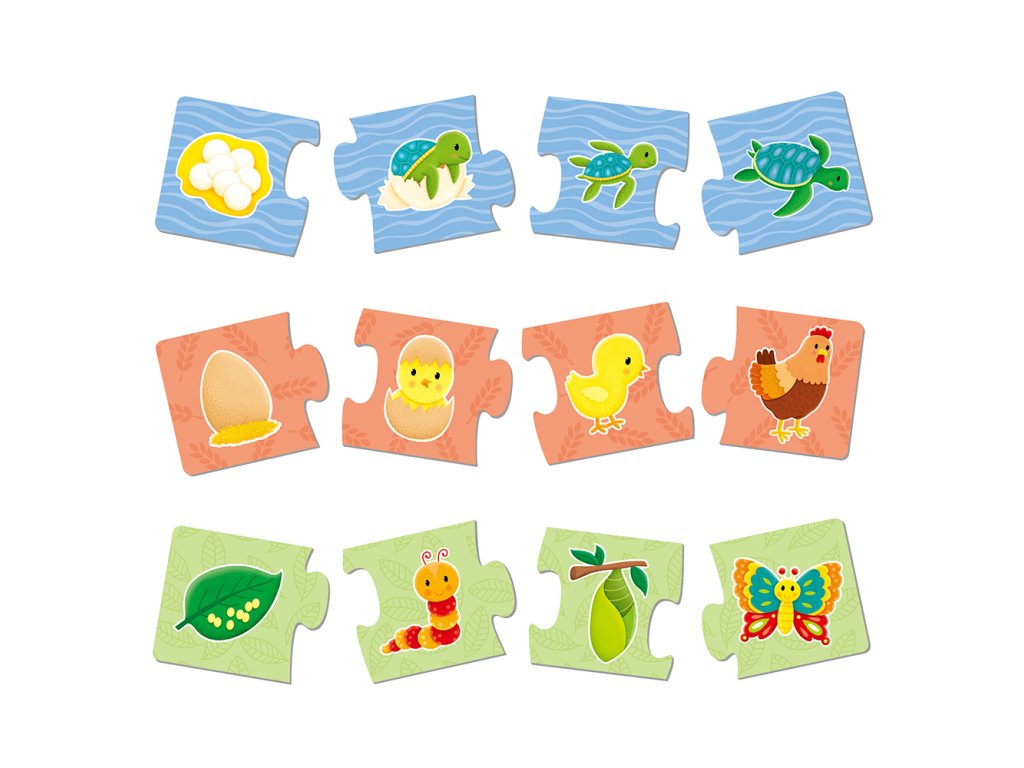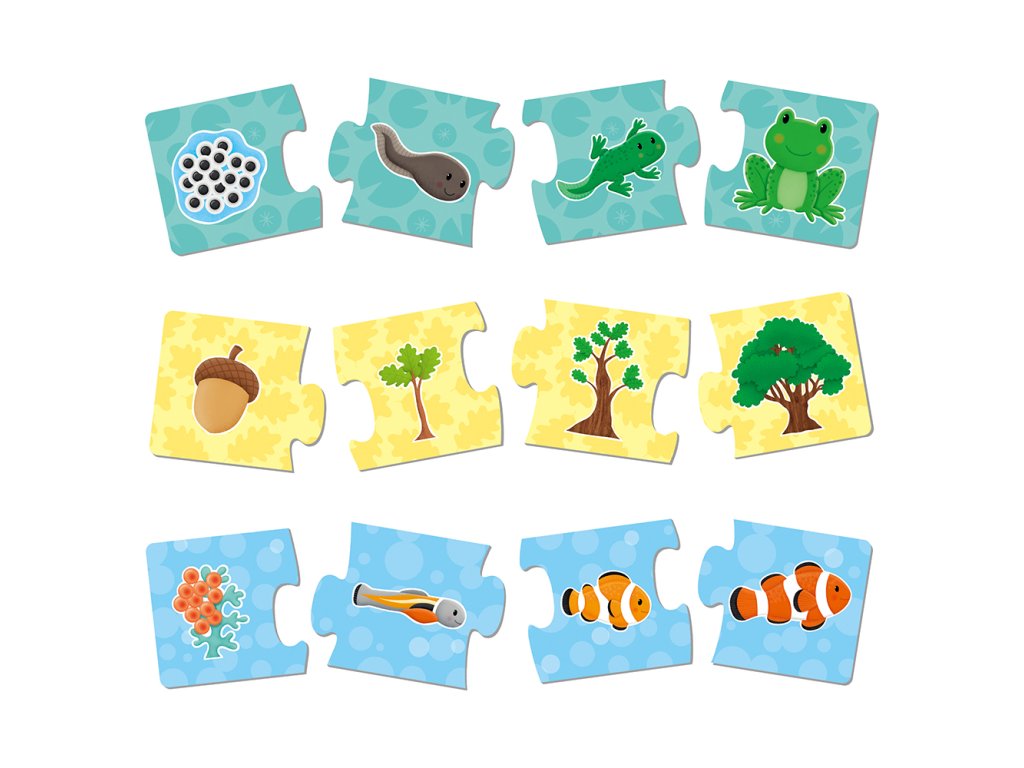 Sada 6 barevných čtyřdílných puzzle zobrazujících životní cykly, které děti učí správné pořadí vývoje.