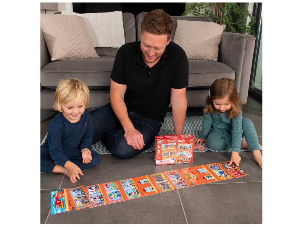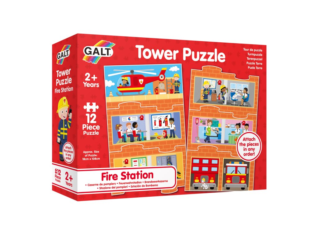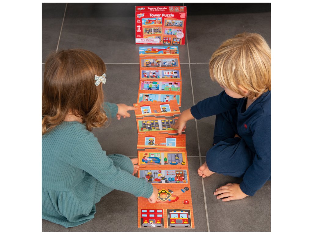 Kreativní puzzle požární stanice skládané do tvaru věže.