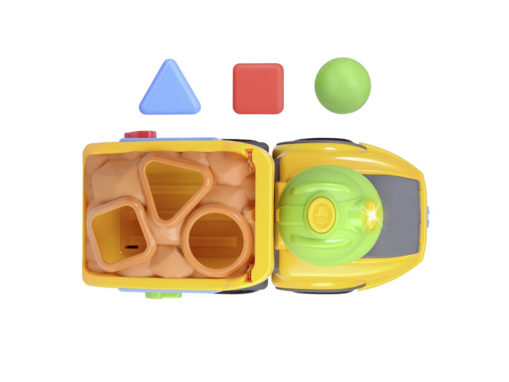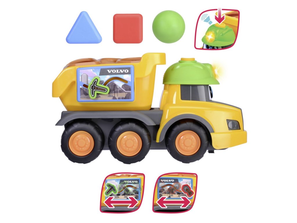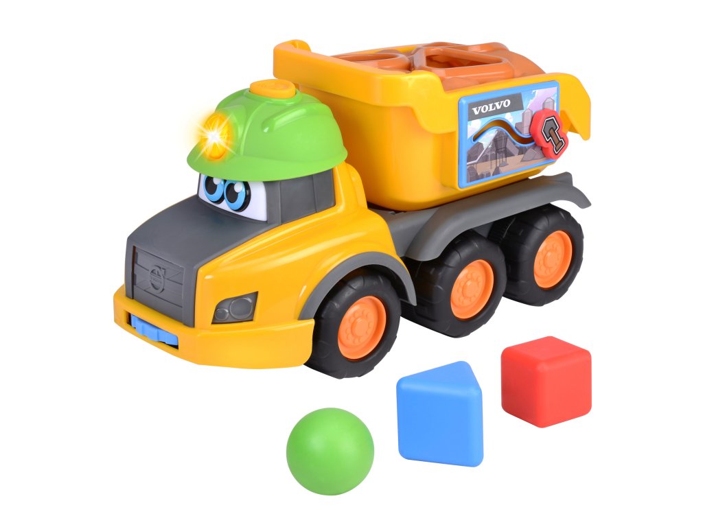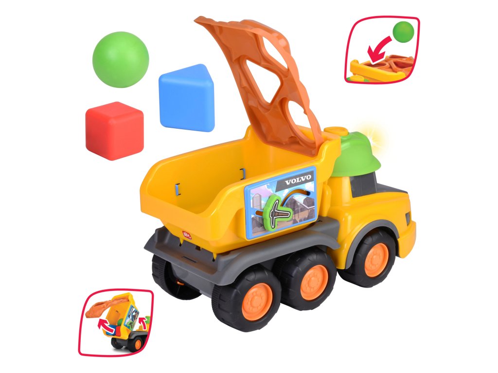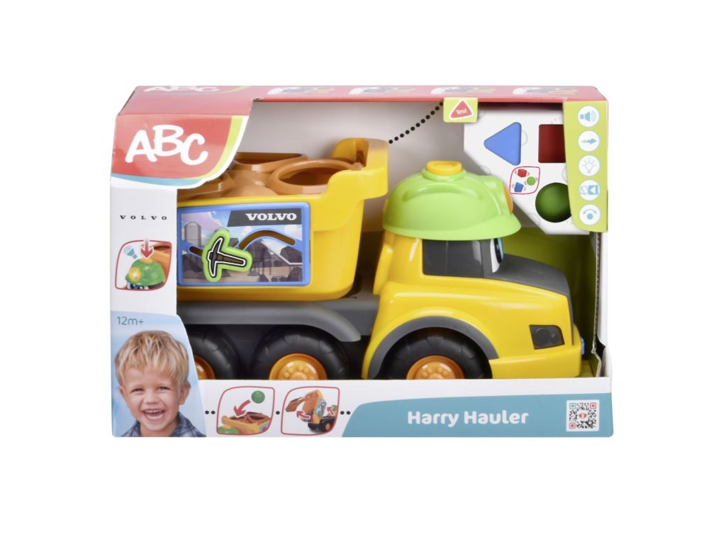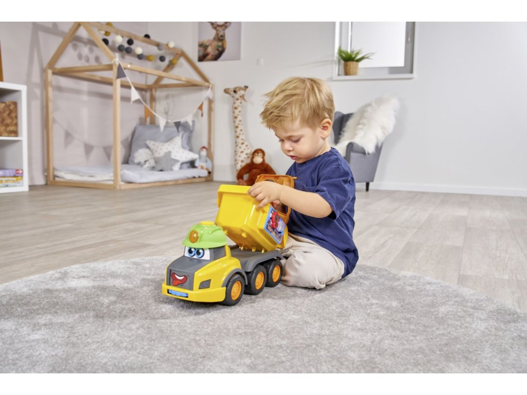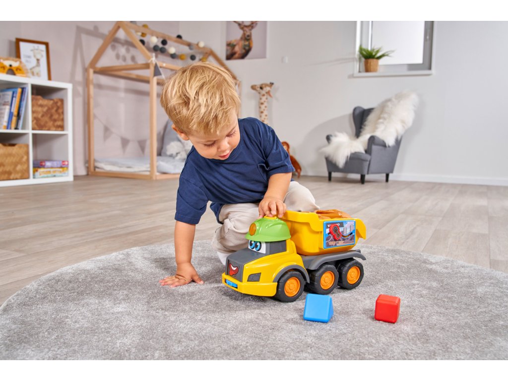 Nákladní auto Harry Hauler s očíčky pro nejmenší. Na volnoběh, třídění tvarů - 3 tvary chrastítek k vložení, zvukový a světelný efekt, posuvné prvky, různá čela, sklápeč dolů a nahoru. Délka 30 cm.