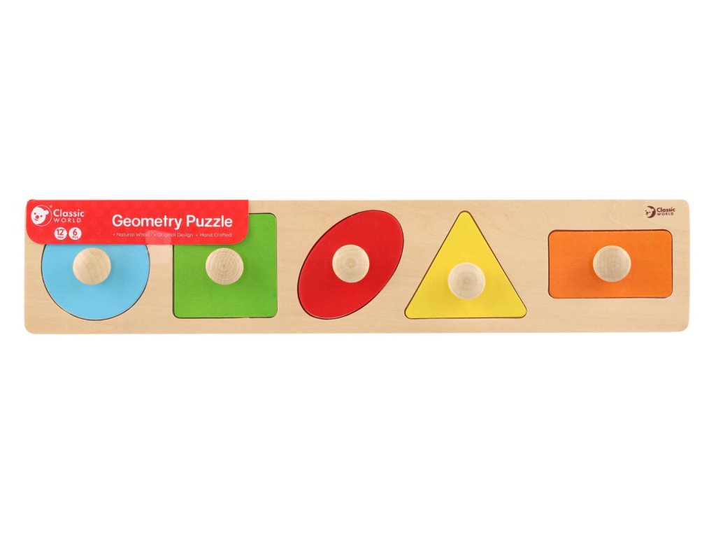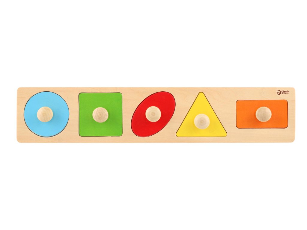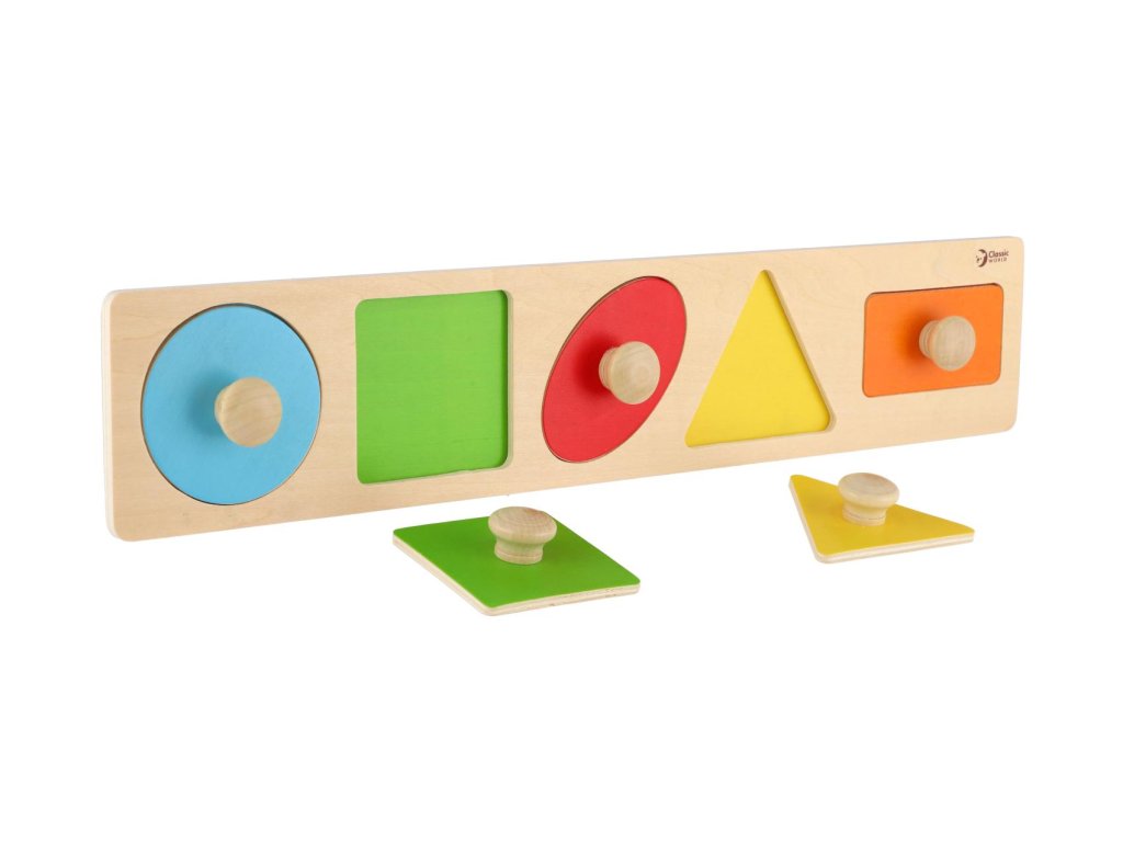 Vkládačka pro nejmenší - geometrické tvary. Vhodné pro děti od 1 roku. 5 různých tvarů. Rozměry vkládačky 45 x 9 x 2 cm. Rozvíjí motorické schopnosti dítěte.