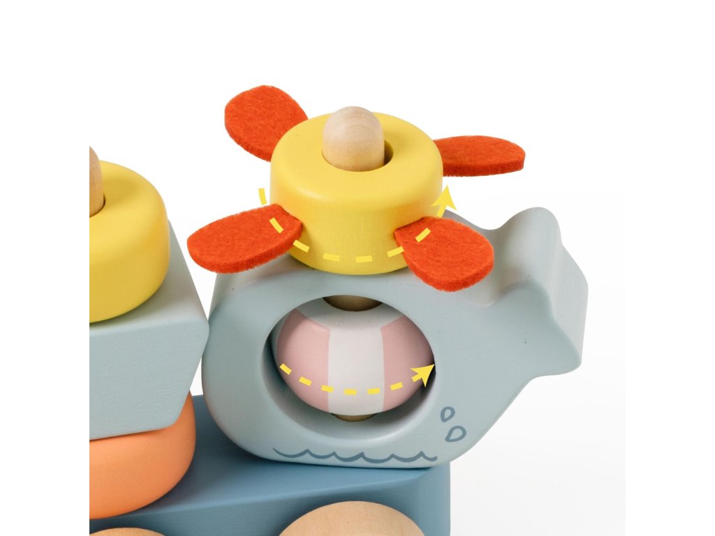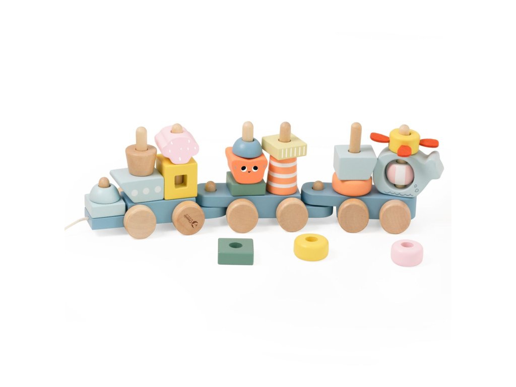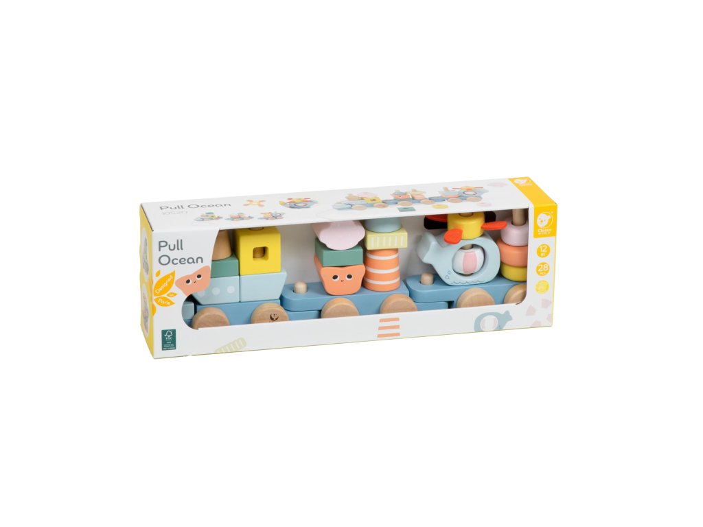 Barevný dřevěný vláček s motivem oceánu přináší zábavu na kolečkách i při skládání! Skládá se z lokomotivy a dvou vagónků, které jsou osazeny dřevěnými kolíky pro navlékání 28 různorodých dílků. Děti si rozvíjejí jemnou motoriku, učí se barvy, tvary i logiku skládání. Díky tahacímu provázku si mohou vláček snadno vzít s sebou po celém bytě. Hrací set v jemných pastelových barvách zaujme každé zvídavé batole. Rozměr balení: 38 × 12 × 8 cm Vhodné pro děti od 12 měsíců.