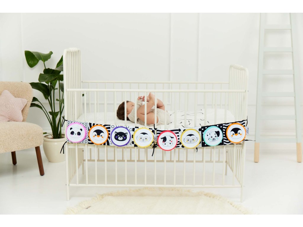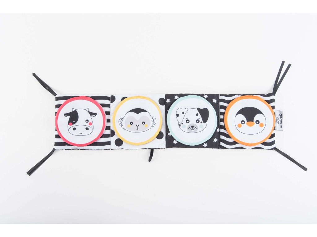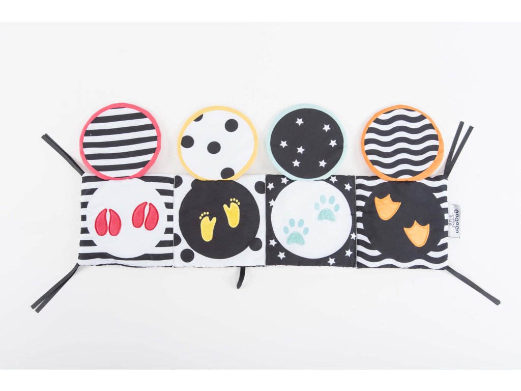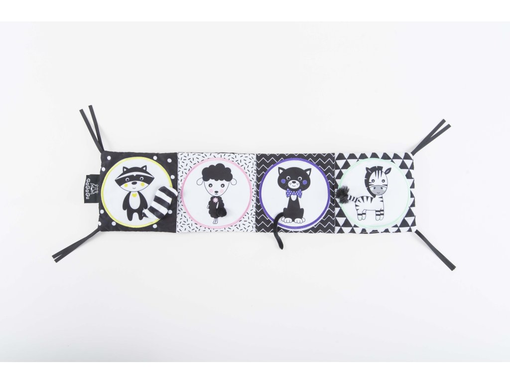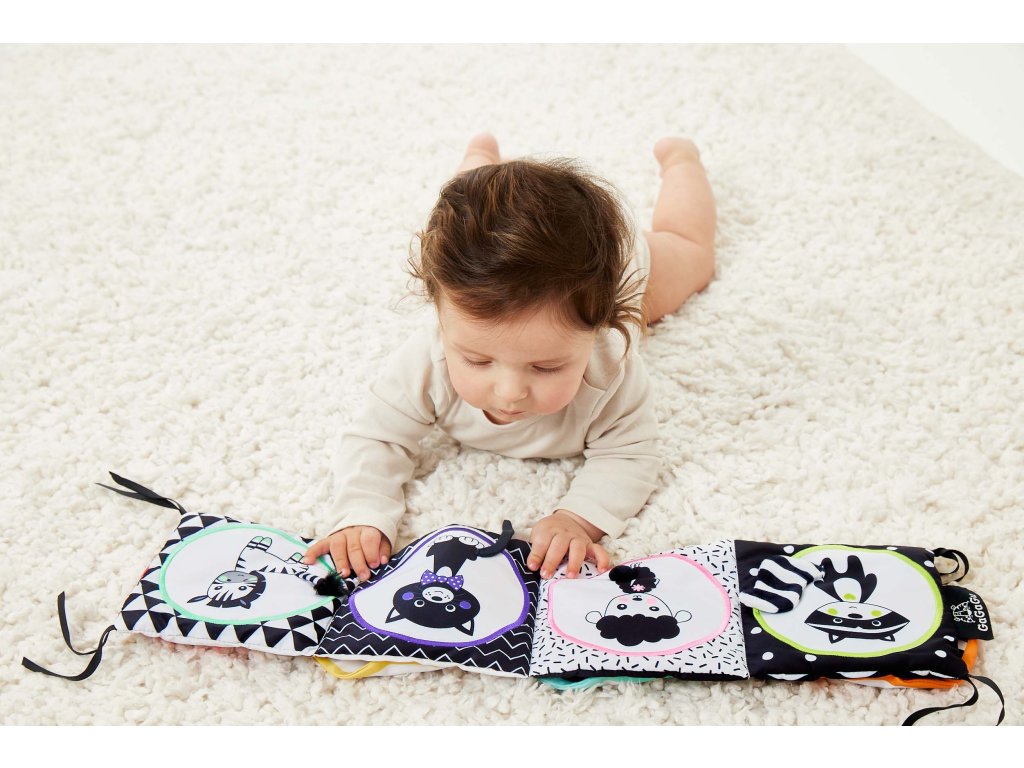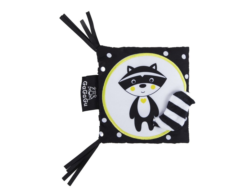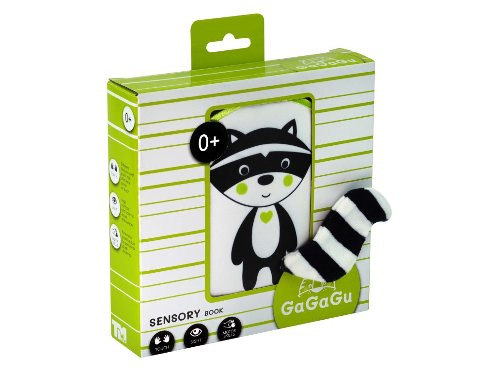 Smyslová knížka GaGaGu má kontrastní barvy a vzory, což stimuluje zrak dítěte. Kniha je oboustranná. Na jedné straně jsou kontrastní ilustrace zvířat s vyšívanými prvky, které jsou pro dítě pod prsty znatelně odlišné textury - stimulace hmatu, učení se různým texturám dítětem. Na druhou stranu jsou tu kulaté plyšové klapky, které dítěti umožní hrát jednu z oblíbených „her“ miminka – a kuku! - každá klapka je potištěna na obou stranách jiným vzorem - jeden prvek, ale dva zcela odlišné vizuální zážitky. Pod plyšovými klapkami s obrázky zvířátek jsou symboly jídla, co zvířátko jí + plyšové klapky mají všitý šustivý materiál a při otevírání a doteku šustí - menší dítě se učí různé tvary a barvy a dostává sluchovou stimulaci, starší dítě se dozví, jakou potravu dané zvíře jí. Hračka je velmi lehká a šikovná, snadno skladná, ideální na procházku nebo výlet. Bez plastových prvků lze díky stuhám připevnit na postýlku nebo kočárek.