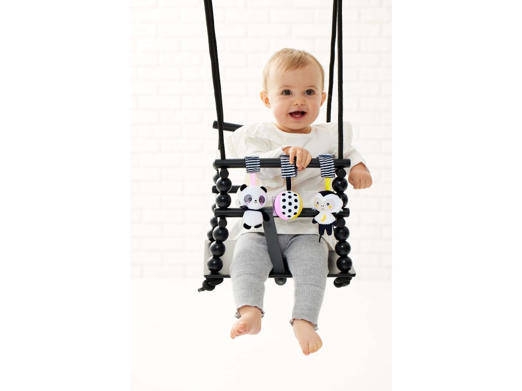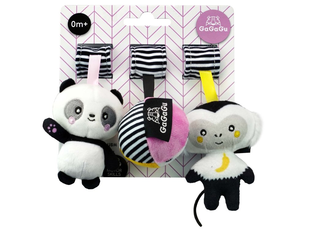 Závěsná plyšová hračka GaGaGu má kontrastní barvy a vzory, které stimulují zrak dítěte. Plyšové prvky - opice, panda a míč - a stuhy vybízejí děti, aby je uchopily a podpořily tzv. jemnou motoriku (pohyby prstů a rukou) a učení motorické koordinace. Pohodlný způsob zapínání na suchý zip (příjemný na dotek a snadné zapínání) vám umožní přívěsek připevnit kamkoli, například na kočárek, na postýlku, na houpačku nebo autosedačku. Hračka je velmi lehká a šikovná, snadno skladná, ideální na procházku nebo výlet. Je určen pro děti ve věku 0m + a je jedním z 12 produktů dostupných pod značkou GaGaGu. Kromě přívěsků i chrastítka, spirála, kniha, smyslové kostky a smyslová podložka. Všechny hračky GaGaGu lze vzájemně kombinovat.Informace o produktu (v bodech):• kontrastní barvy a vzory – stimulují zrak dítěte• plyšové prvky - opice, panda a míč