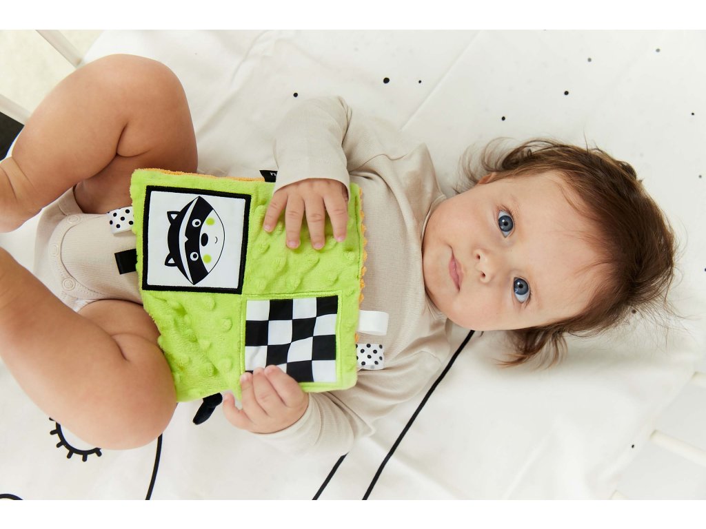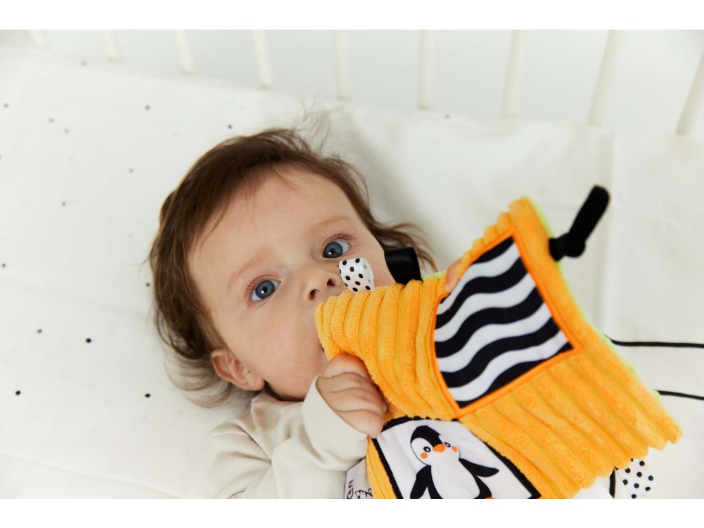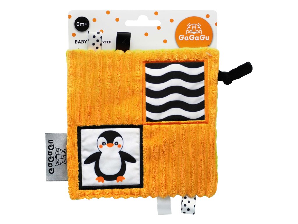 Dečka má kontrastní barvy a vzory, což stimuluje zrak dítěte a šustivý materiál uvnitř hračky stimuluje jeho sluch. Dítě má možnost poznávat různé textury, díky kterým si rozvíjí hmat. Doplňkové stuhy, plyšová poutka, velký štítek - usnadňují dítěti uchopení hračky a podporují tzv. cvičení jemné motorické dovednosti (pohyby prstů a rukou). Dečka je oboustranná - na každé straně má jinou grafiku: na jedné straně tučňák - na druhé mýval. Hračka je velmi lehká a šikovná, snadno skladná, ideální na procházku nebo výlet. Je určena pro děti ve věku 0m + a je jedním z 12 produktů dostupných pod značkou GaGaGu. Kromě dečky jsou to i chrastítka, spirála, přívěsky, knížky, smyslové kostky a smyslová podložka.Informace o prodktu (v bodech):• kontrastní barvy a vzory – stimulují zrak dítěte• různé textury materiálu – stimulace hmatu• šustivý materiál – rozvoj sluchu