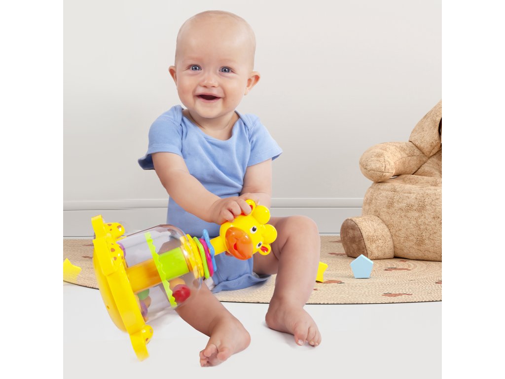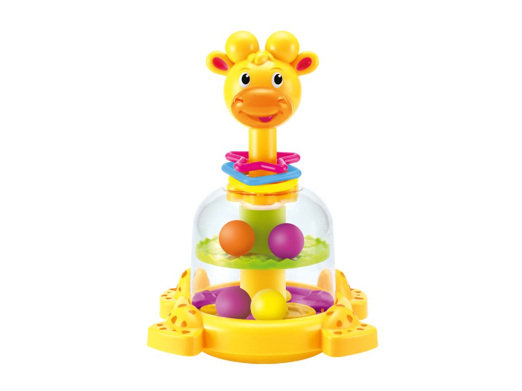 Pestrobarevný mechanický kolotoč ve tvaru žirafy je naplněný barevnými kuličkami, které budou po zmáčknutí hlavy rotovat, skákat a vydávat chrastící zvuk.Tato hračka zaujme a pobaví i ty nejmenší děti.