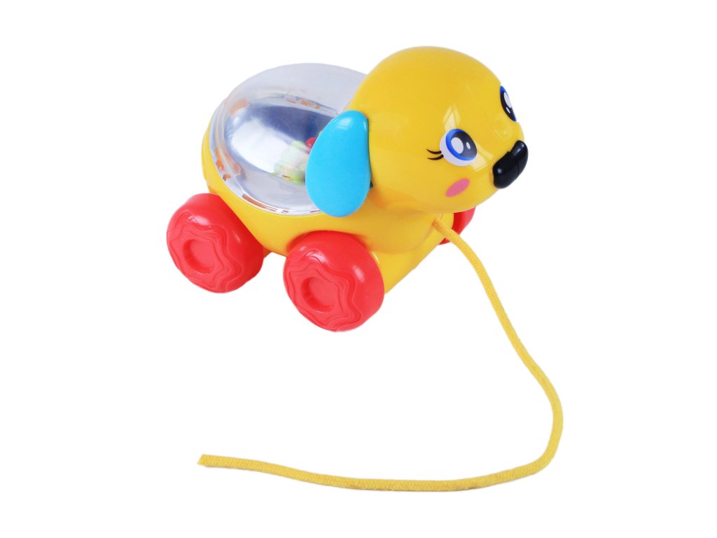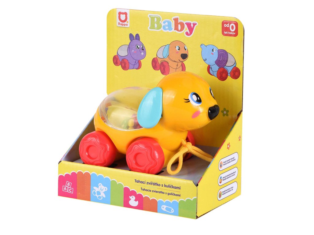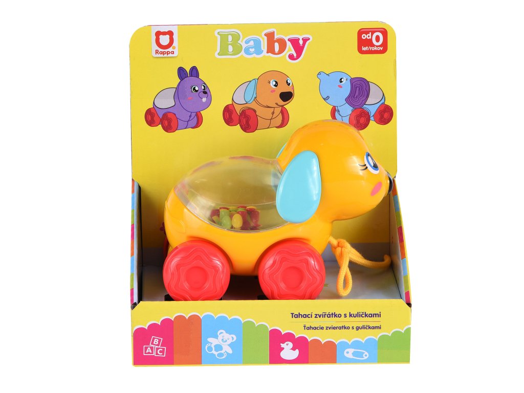 Veselé zvířátko pejsek na kolečkách s barevnými kuličkami. Taháním či pohybem zvířátka začnou kuličky uvnitř poskakovat. Tato hračka zaujme a pobaví i ty nejmenší děti.