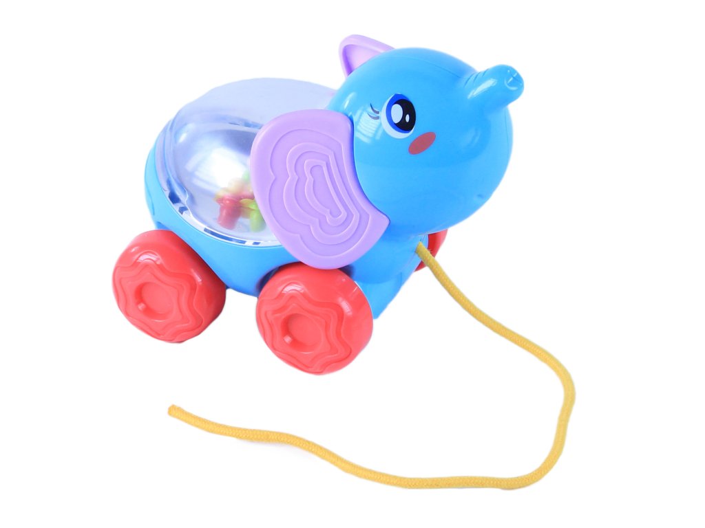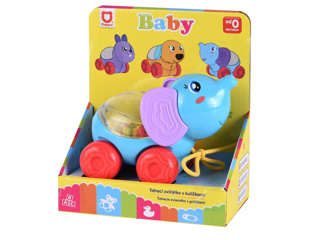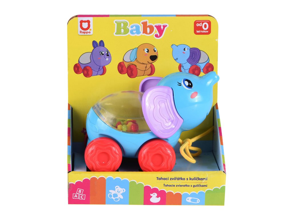 Veselé zvířátko slon na kolečkách s barevnými kuličkami. Taháním či pohybem zvířátka začnou kuličky uvnitř poskakovat. Tato hračka zaujme a pobaví i ty nejmenší děti.