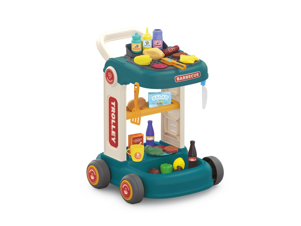 Grilovací vozík. Rozměry 34x36x37 cm. Balení obsahuje vozík na kolečkách, potraviny, nádobí, příslušenství na grilování.