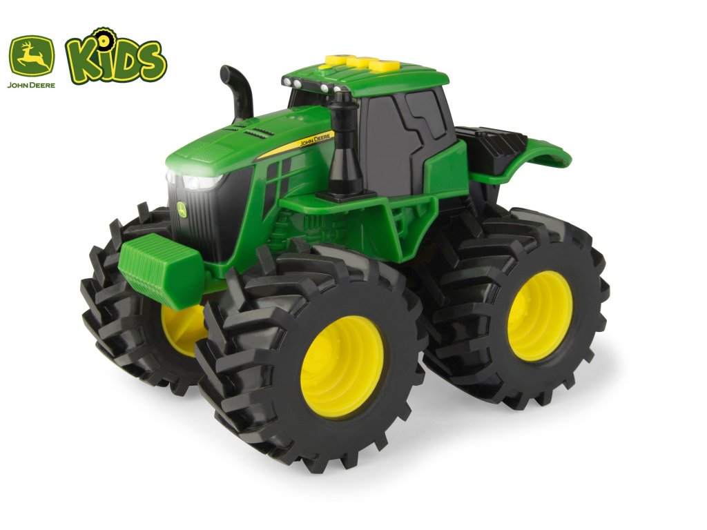 JD Kids Monster Treads Traktor se zvukovými a světelnými efekty. Aktivace tlačítky na střeše traktoru. Gumové pneumatiky, volná kola. Baterie 3xAG13 (LR44) jsou součástí balení.