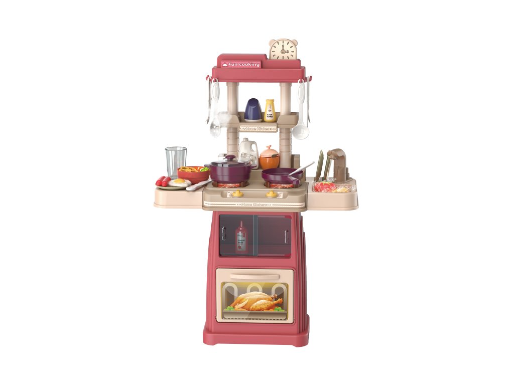 Kuchyňka s párou a efekty. Rozměry 44x21x66 cm. Kuchyňce teče po naplnění vodou z kohoutku voda, při vaření vypouští vodní páru. Varná deska při vaření svítí. Trouba má otevírací dvířka. Návod na složení kuchyňky na obalu. Balení obsahuje kuchyňku, příbory, nádobí, potraviny. 3xAA baterie nejsou součástí.