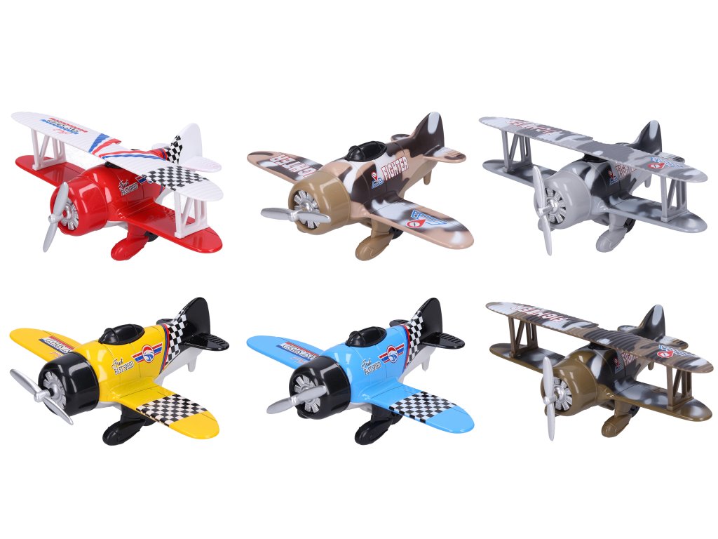 Letadlo kovové. Rozměry 12x15,5x5,8 cm. Na zpětné natažení. 6 ks display box. 6 variant.