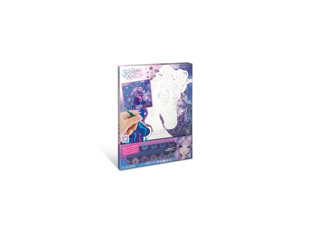 tištěné plátno s dřevěným rámem, malování podle čísla, potištěné barevné plátno, 14 akrylových barev, 2 štětce, třpytivý lak, kamínky, instrukce, příběh Nebulie
