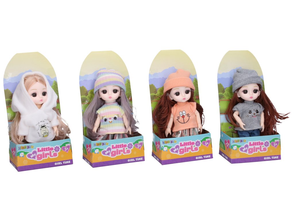 Panenka v zimním oblečení. Velikost 15 cm. Pohyblivé klouby. Display box 12 ks. 3 varianty - bílá, šedá, červená.