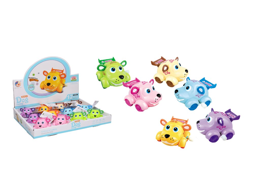 Pes natahovací plastový. Velikost 8 cm. Display box 12 ks. 6 variant - modrá, zelená, růžová, žlutá, fialová, hnědá.