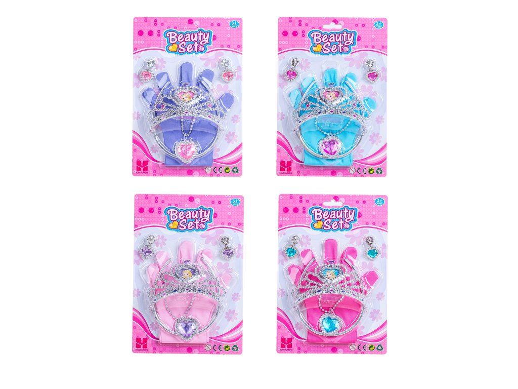 Šperky a rukavičky sada doplňků. Korunka 12,5 cm. Obsah balení - rukavičky, korunka, čelenka, náhrdelník, 2 náušnice. 4 varianty - modrá, fialová, růžová, červená.