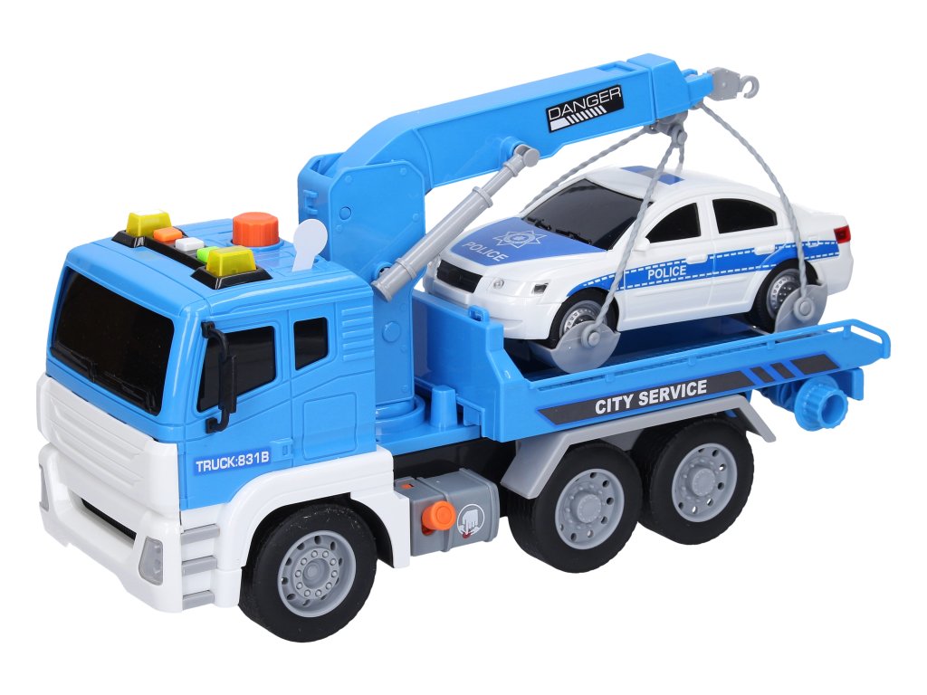 Tahač s autem a efekty. Rozměry 30x13x17 cm. Na setrvačník. Světelné a zvukové efekty tlačítky na kabině tahače. 3xAG13 baterie součástí. Velké oranžové tlačítko na kabině - hydraulika nakládacího ramene - zvedání. Oranžová páčka mezi koly položení (uvolnění) nakládacího ramene.