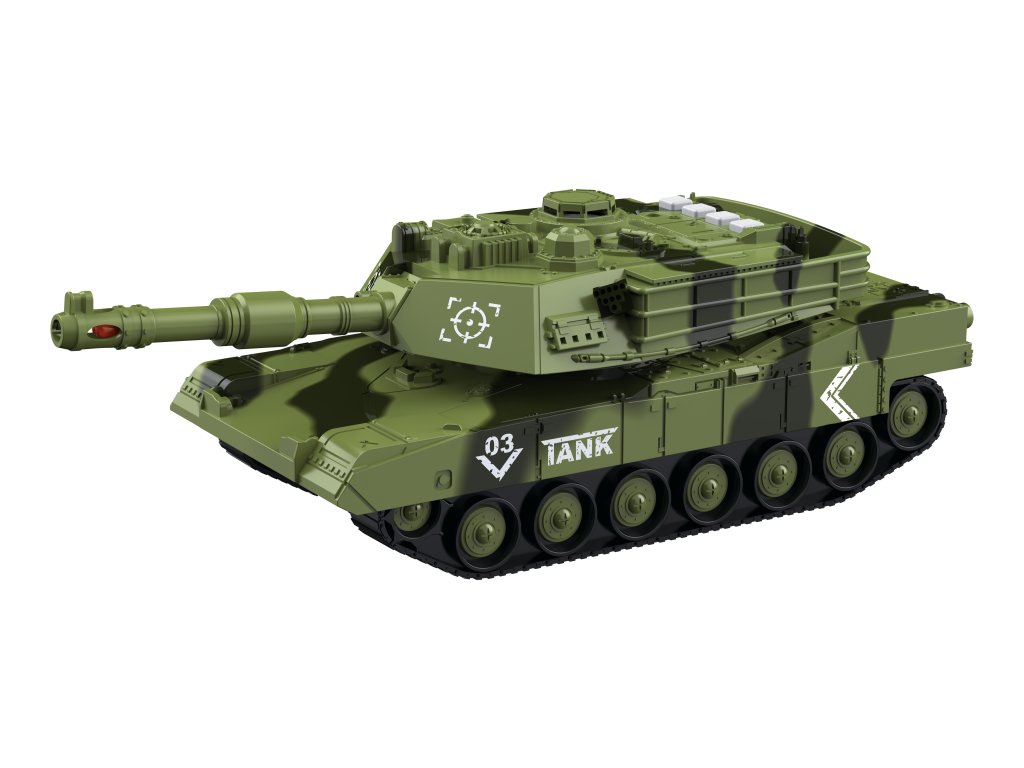 Tank s efekty. Velikost 25 cm. Na setrvačník. Světelné a zvukové efekty tlačítky na tanku. 3xAG13 baterie součástí.