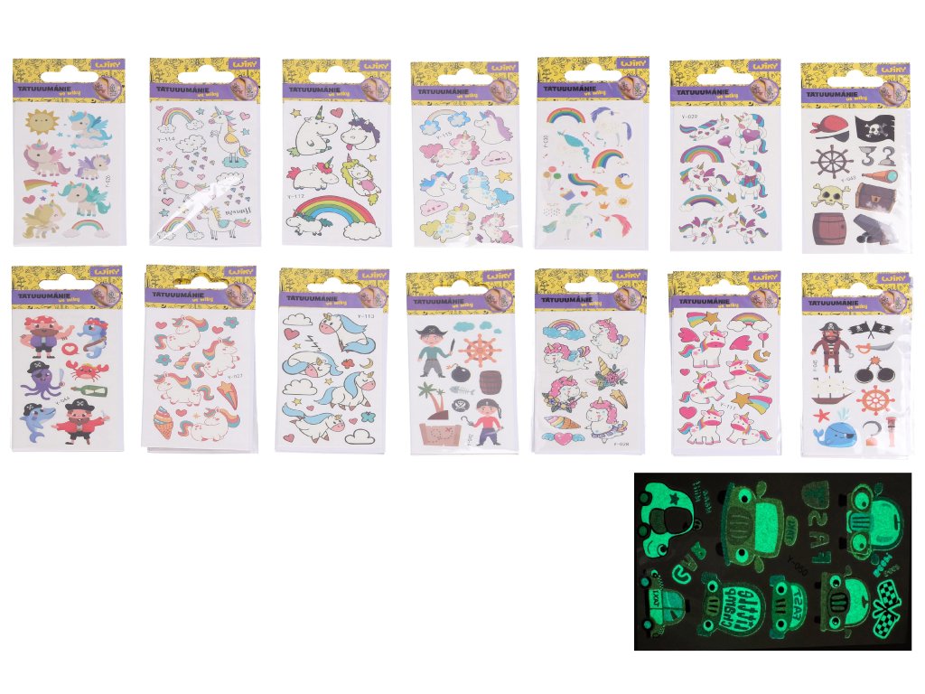 Tetovací obtisky o velikosti 6x10,5 cm svítící ve tmě. Velký mix: jednorožci a piráti.