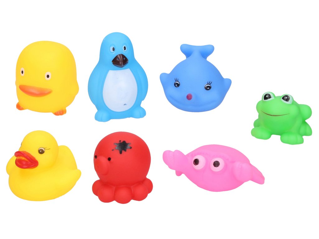 Zvířátka do vany gumová. Velikost 6 cm. Sada obsahuje 7 zvířátek - tučňák, chobotnice, rybka, kachnička, žabka, kuřátko, krab.