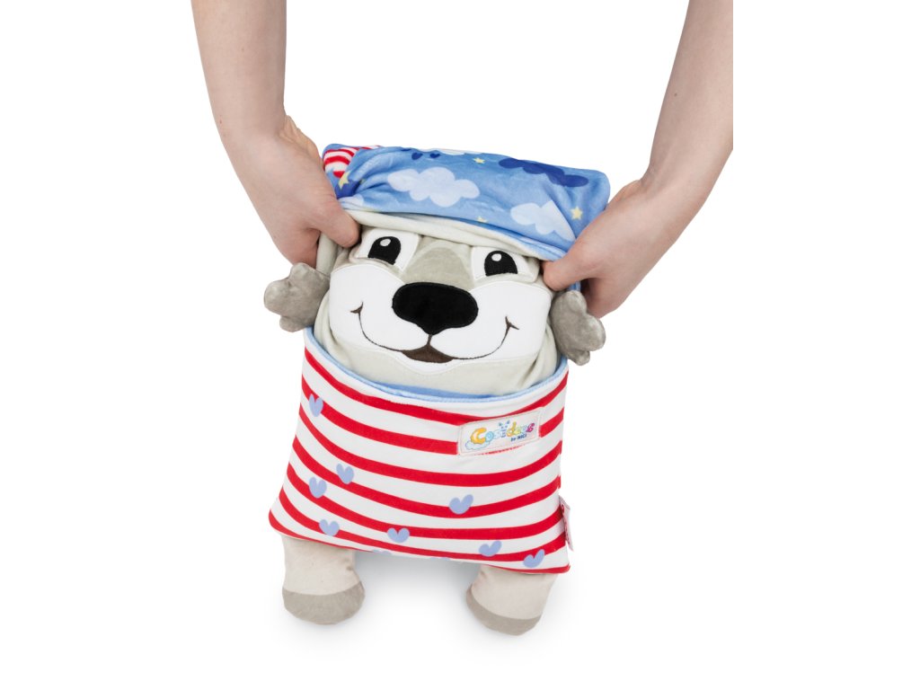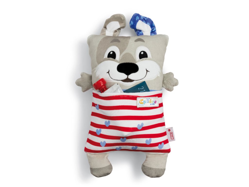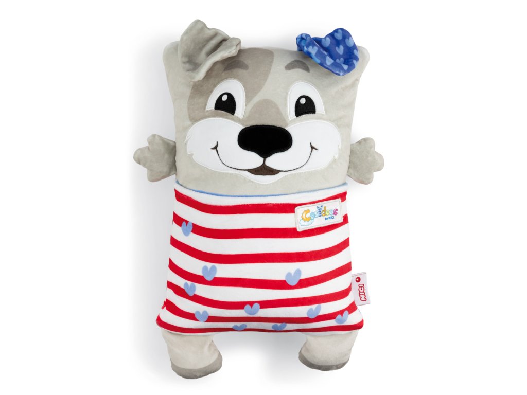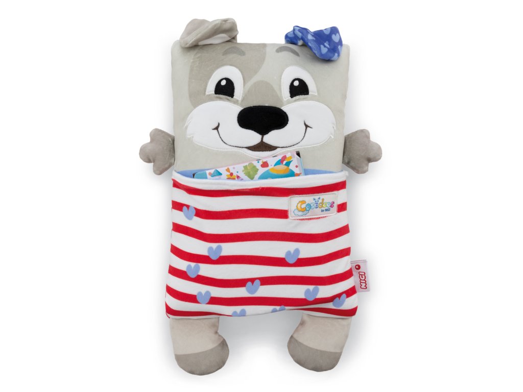 Pejsek Cosidoos je nadýchaná plyšová hračka, kterou lze snadno proměnit z veselého denního společníka v uklidňující zvířátko a polštářek na spaní. Šedý pejsek s modrým uchem kombinuje zábavu při hraní s pocitem pohody a zároveň podporuje pochopení rytmu dne a noci. Díky tomu se stává přechod k večernímu usínání opravdovým zážitkem. Pejska lze jediným jednoduchým pohybem ruky snadno převrátit a změnit tak barvy i design podle denní doby. Během dne pejsek Cosidoos podporuje kreativní hru a stimuluje fantazii, zatímco v noci se stává něžným společníkem pro klidný noční spánek. Měkké kapsy jsou ideální pro uložení malých pokladů nebo důležitých předmětů. Oboustranný zázrak vyrobený z vysoce kvalitního, super měkkého plyše NICI je víc než jen hračka – je to věrný přítel, který plynule přechází mezi hrou a odpočinkem. Rozměry hračky: 30 x 20 x 11 cm. Věk 12 m+