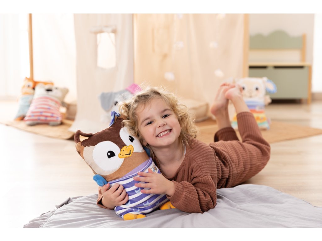 Sovička Cosidoos je nadýchaná plyšová hračka, kterou lze snadno proměnit z veselého denního společníka v uklidňující zvířátko a polštářek na spaní. Roztomilá sovička kombinuje zábavu při hraní s pocitem pohody a zároveň podporuje pochopení rytmu dne a noci. Díky tomu se stává přechod k večernímu usínání opravdovým zážitkem. Sovičku lze jediným jednoduchým pohybem ruky snadno převrátit a změnit tak barvy i design podle denní doby. Během dne sovička Cosidoos podporuje kreativní hru a stimuluje fantazii, zatímco v noci se stává něžným společníkem pro klidný noční spánek. Měkké kapsy jsou ideální pro uložení malých pokladů nebo důležitých předmětů. Oboustranný zázrak vyrobený z vysoce kvalitního, super měkkého plyše NICI je víc než jen hračka – je to věrný přítel, který plynule přechází mezi hrou a odpočinkem. Rozměry hračky: 30 x 20 x 11 cm. Věk 12 m+