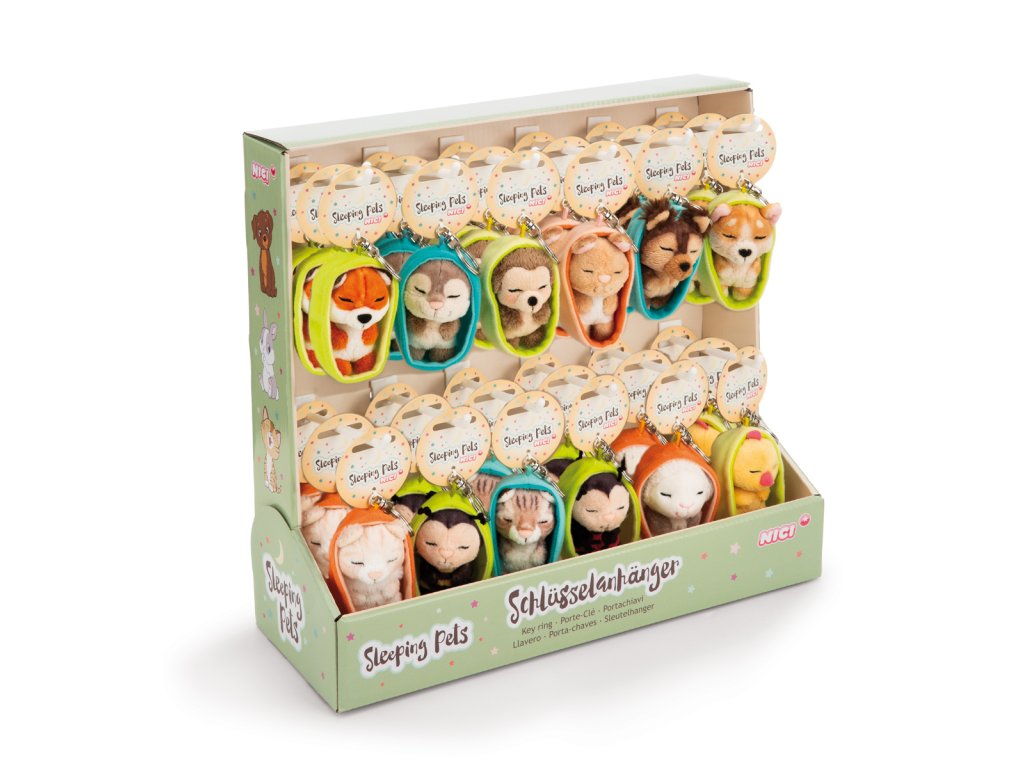 CDU NICI Pultový display – Spící zvířátka – klíčenky, plný. Klíčenky o velikosti 12 cm, vyrobené z hebkého plyše NICI. Speciální edice klíčenek Sleeping Pets představuje rozkošná zvířátka spící v plyšovém košíku. Plyšovou klíčenku lze pomocí pevného kovového kroužku připevnit na klíče, batoh, školní tašku nebo peněženku. Klíčenka je součástí světa produktů NICI GREEN. Pro produkty NICI GREEN se používá téměř výhradně plyš a výplňový materiál vyrobený z recyklovaných materiálů. Pro tento účel se na RPET zpracovávají primárně recyklované PET lahve. Tento CDU obsahuje 36 ks/12 druhů zvířátek. Assort je náhodný mix modelů. Výběr nelze ovlivnit. Varianty, které může assort obsahovat: liška, vydra, ježek, zajíček, jorkširský teriér, velšský Corgi, béžová kočička, hnědá kočička, beruška, včelka, jehně, kuře. Rozměry klíčenky cca: 12,5 x 5 x 5 cm. Rozměry CDU:. Věk: 3+