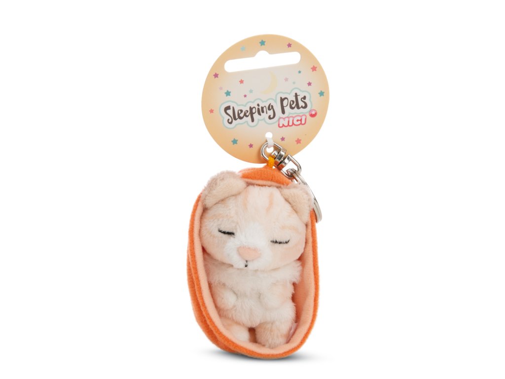NICI klíčenka spící Kočička béžová 12 cm, oranžový košík, GREEN
