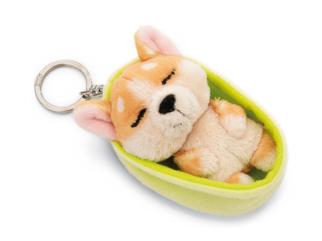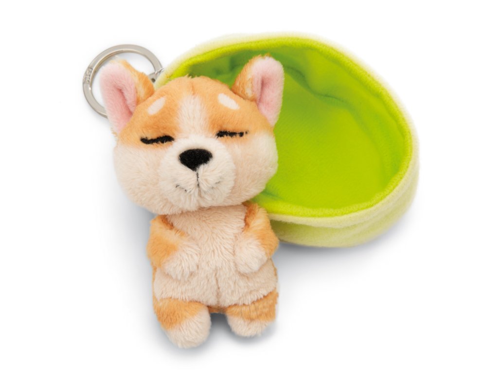 NICI klíčenka spící Pejsek Welsh Corgi 12 cm, světle zelený košík, GREEN