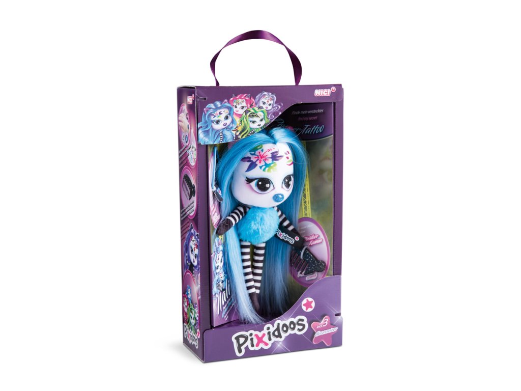 Pixidoos jsou skvělým spojením plyšové hračky a okouzlující panenky! Roztomilé a cool stylové v jednom! Pestrobarevná panenka Nali má super jemné modré vlasy a 3dílnou sadu doplňků ve stylové dárkové krabičce. Sada doplňků obsahuje tetovací samolepky, třpytivý hřeben a náramek přátelství Pixidoos. Výška: 20cm. Věk: 3+