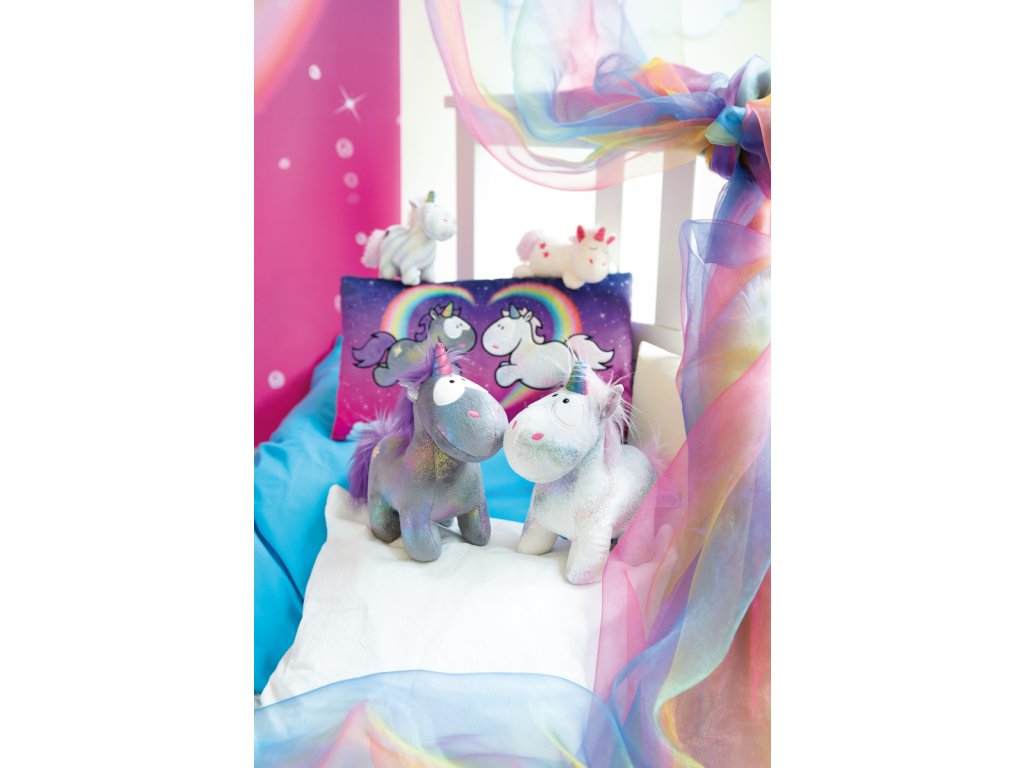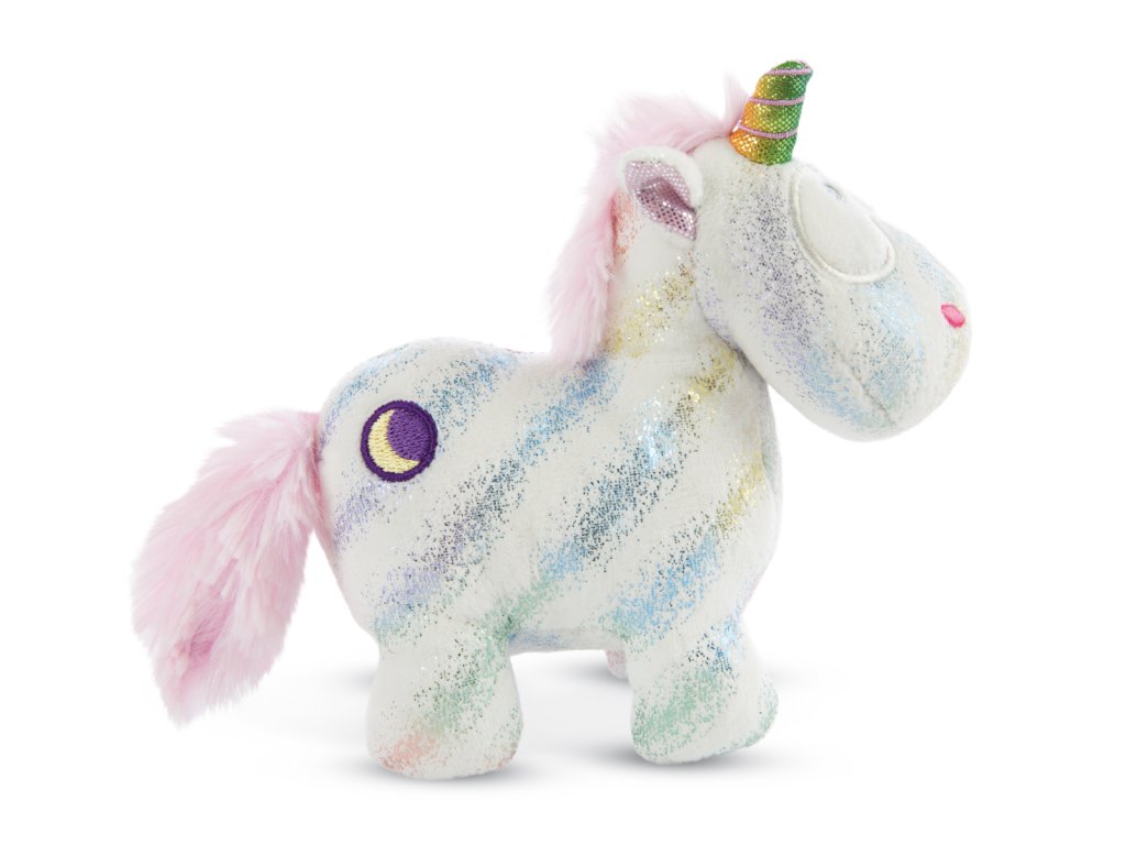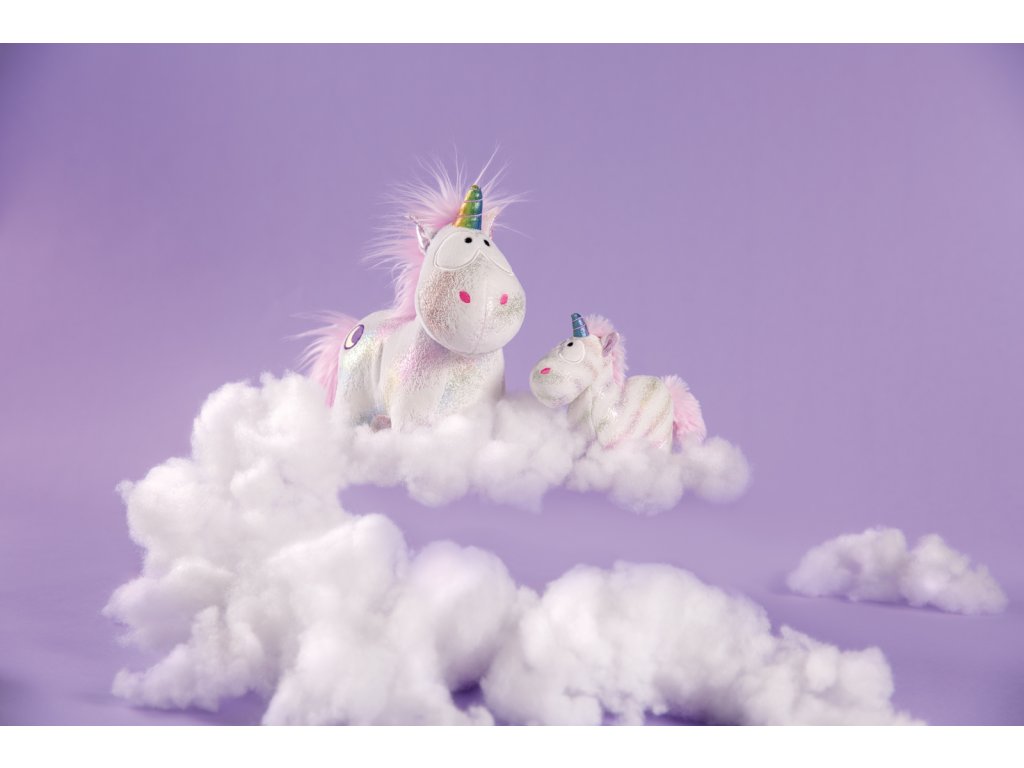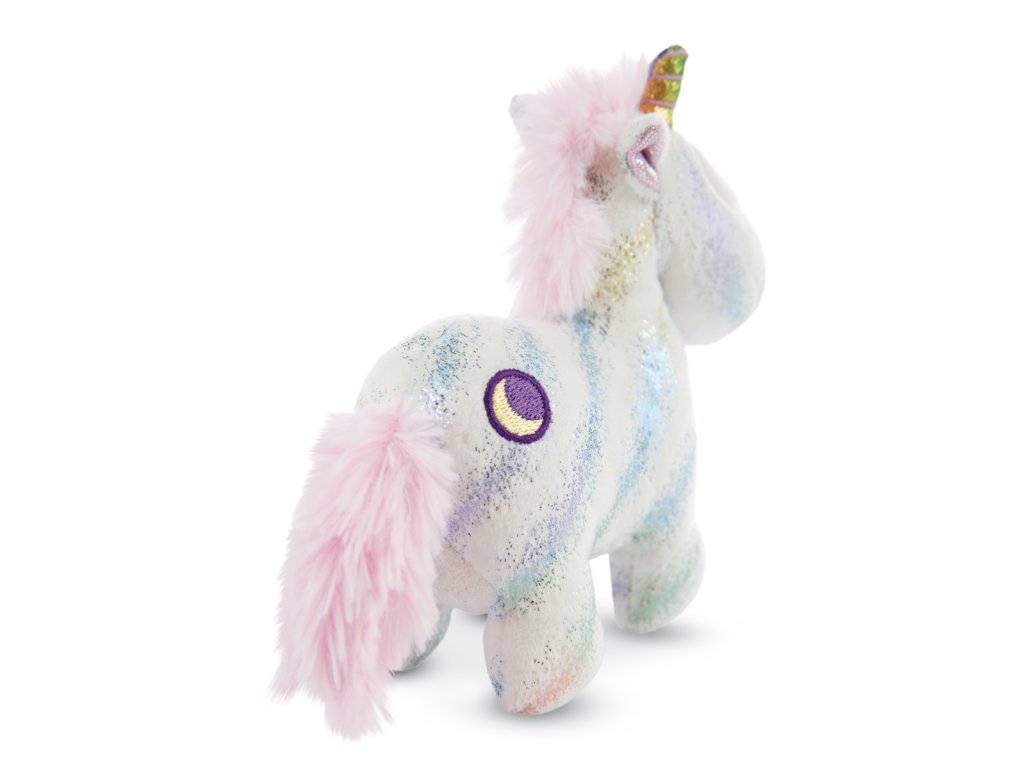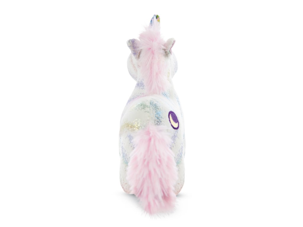 Chtěli byste trochu magie? Unicorn Moon Keeper je bílý jako samotný měsíc a fascinuje svým třpytivým čelním rohem v duhových barvách a poutavým potiskem metalické fólie na nadýchaném hebkém plyšovém těle. Hříva a ocas v jemném růžovém odstínu, lesklé stříbrné uši, výraz tváře, který nemůže být roztomilejší, a detailní výšivka ve tvaru měsíce na boku dodávají tomuto jedinečnému plyšovému jednorožci velmi zvláštní nádech. Pro produkty NICI GREEN používáme téměř výhradně plyš a výplňový materiál vyrobený z recyklovaných materiálů. K tomuto účelu se zpracovávají především recyklované PET lahve. Výška : 13cm. Věk: 0+