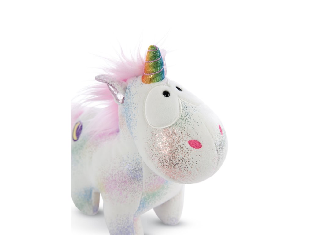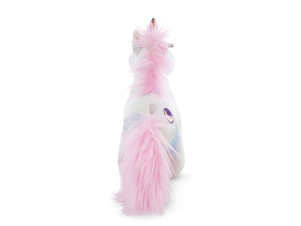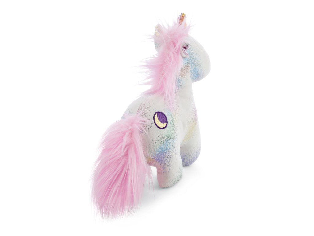 Chtěli byste trochu magie? Unicorn Moon Keeper je bílý jako samotný měsíc a fascinuje svým třpytivým čelním rohem v duhových barvách a poutavým potiskem metalické fólie na nadýchaném hebkém plyšovém těle. Hříva a ocas v jemném růžovém odstínu, lesklé stříbrné uši, výraz tváře, který nemůže být roztomilejší, a detailní výšivka ve tvaru měsíce na boku dodávají tomuto jedinečnému plyšovému jednorožci velmi zvláštní nádech. Pro produkty NICI GREEN používáme téměř výhradně plyš a výplňový materiál vyrobený z recyklovaných materiálů. K tomuto účelu se zpracovávají především recyklované PET lahve. Výška : 13cm. Věk: 0+