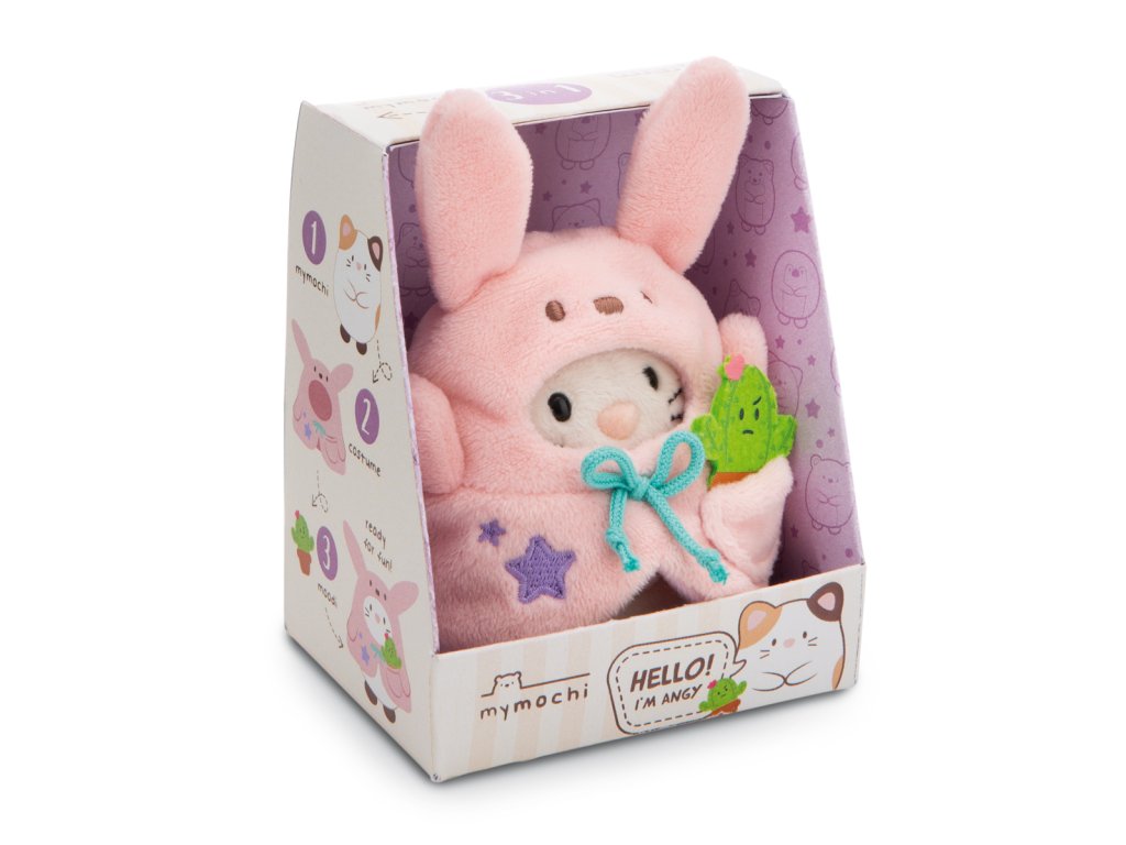 „Ahoj, já jsem Angy a nemám ráda nudu!“ Angy, tříbarevná roztomilá kočička vyrobená z hebkého plyše NICI, je oblečená v nadýchaném růžovém kostýmu králíčka zdobeném fialovými hvězdičkami a společně se svým Moodi, malým kaktusem a milovaným kamarádem. Okouzlující sada plyšových hraček 3 v 1 je balena v dárkové krabičce s informacemi o jméně, charakterových vlastnostech, herním konceptu a dalších postavičkách Mymochi. S pomocí vyměnitelných plyšových kostýmů se každý Mymochi může převléct do jiné role. Poutko na hlavě každé plyšové hračky Mymochi umožňuje připevnění na klíče, náhrdelníky, oblečení nebo batohy. Mymochi se během chvilky promění v lifestylový doplněk, které zaručeně přitáhne pozornost. Mymochi kamarádi se rychle stanou každodenními společníky, talismany pro štěstí, kamarády na hraní, mazlíčky a sběratelskými předměty. Rozměry hračky: 8 x 8 x 8 cm. Věk: 12 m+