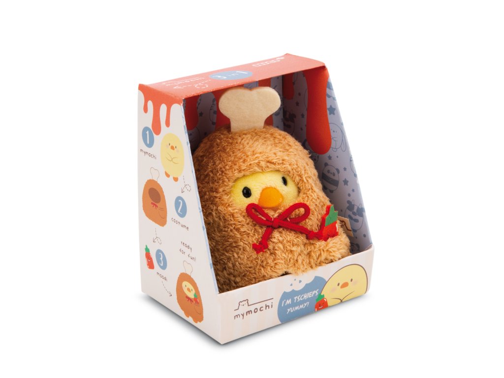 „Ahoj, já jsem Tschieps a jsem naprosto parádní!“ Tschieps je citronově žluté kuřátko, roztomilé, vysoké 8 cm, vyrobené z hebkého plyše NICI. Tschieps je oblečený v nadýchaném hnědém kostýmu, který připomíná kuřecí stehýnko, a dodává se s oblíbeným kamarádem a mazlíčkem malou lahvičkou chilli omáčky. Okouzlující sada plyšových hraček 3 v 1 je uložena v atraktivní dárkové krabičce s informacemi o jméně, charakterových vlastnostech, herním konceptu a dalších postavičkách Mymochi. S pomocí vyměnitelných plyšových kostýmů se každý Mymochi může převléct do jiné role. Poutko na hlavě každé plyšové hračky Mymochi umožňuje připevnění na klíče, náhrdelníky, oblečení nebo batohy. Mymochi se během chvilky promění v lifestylový doplněk, které zaručeně přitáhne pozornost. Mymochi kamarádi se rychle stanou každodenními společníky, talismany pro štěstí, kamarády na hraní, mazlíčky a sběratelskými předměty. Rozměry hračky: 8 x 8 x 8 cm. Rozměry balení: 10,5 x 8,5 x 6,5 cm. Věk: 12 m+