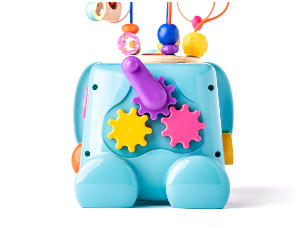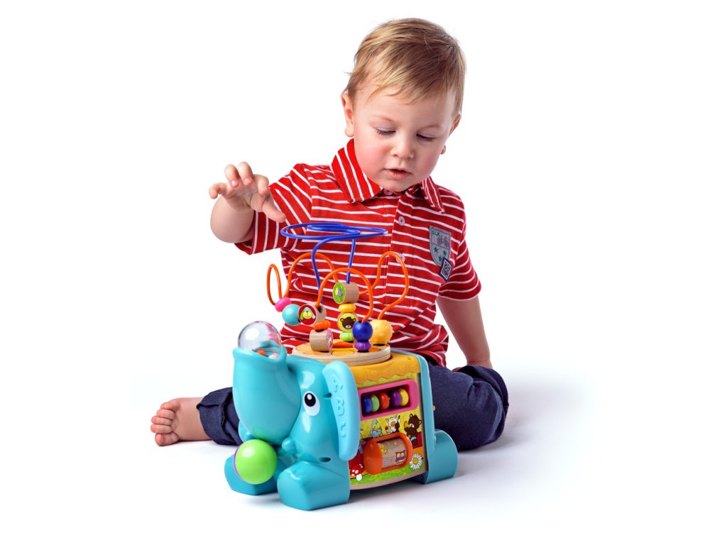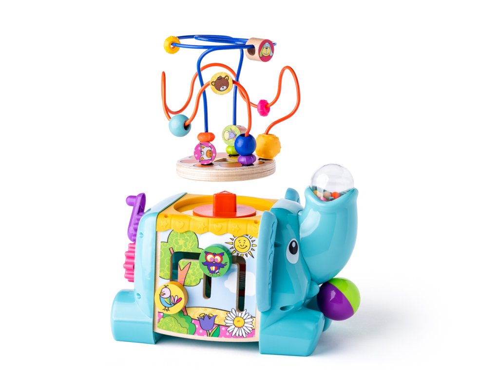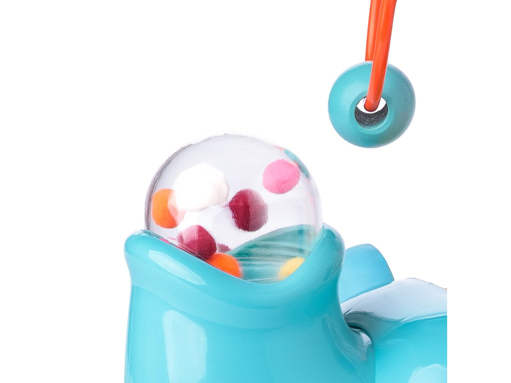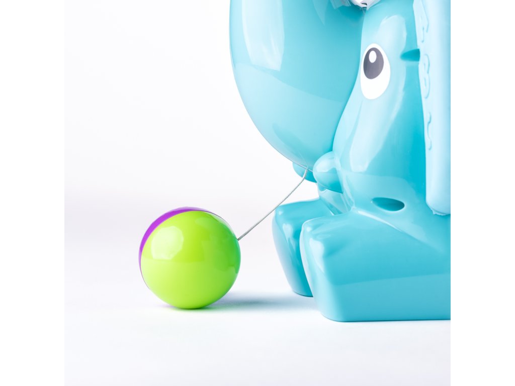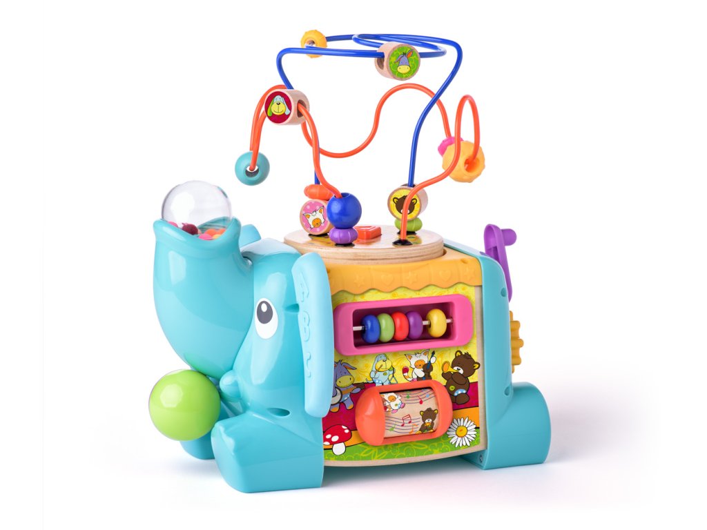 Didaktický slon nabízí dětem nespočet herních variant. Barevné provedení zaujme každého malého objevitele. Zatáhněte za míč v pusince slona, pusťte a sledujte korálky v chobotu. Kličkou na zadečku rozpohybujete ozubená barevná kolečka. Na boku slona naleznete malé bludiště se sovičkou a ptáčkem. Na druhém boku je umístěno počítadlo s barevnými korálky a váleček s notami. Na zádech nosí slon nádherný labyrint, který lze odejmout a děti si s ním mohou hrát samostatně. S touto hračkou děti procvičují nejen jemnou motoriku, trpělivost, přesnost, barvy, ale i soutěživost. Rozměr: 27 x 18,5 x 29 cm. Věk: 6m+.