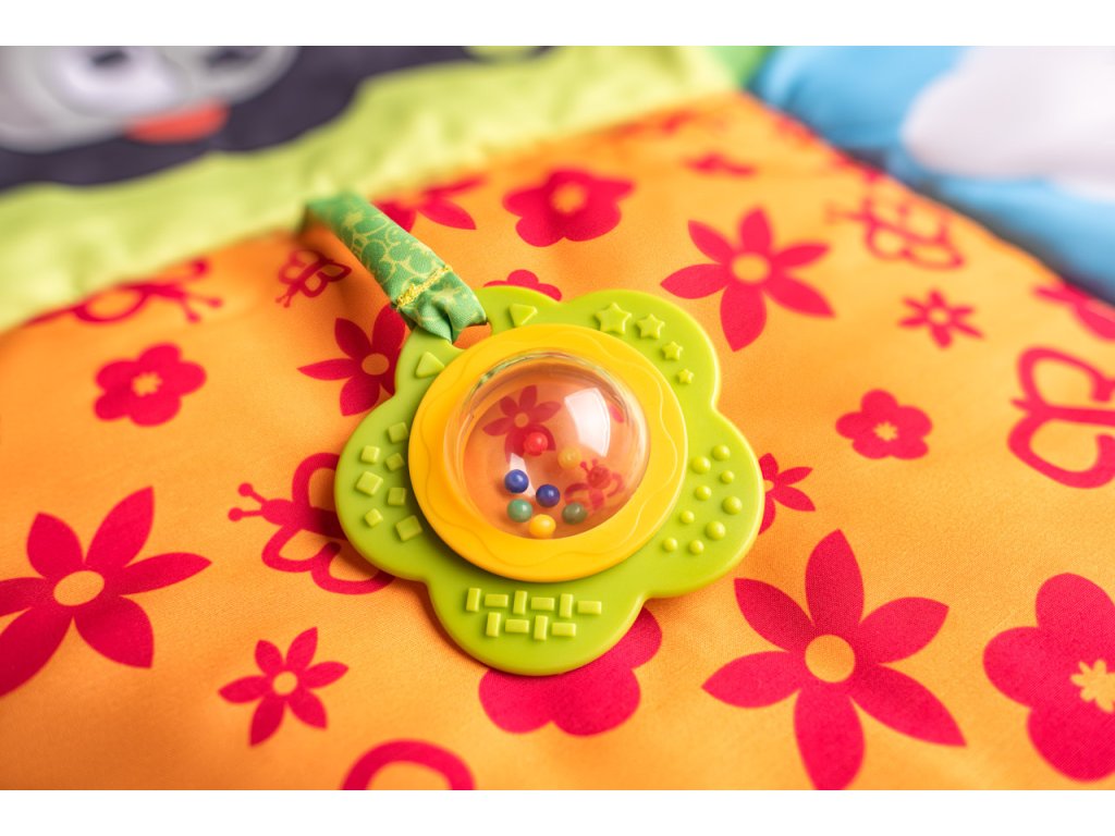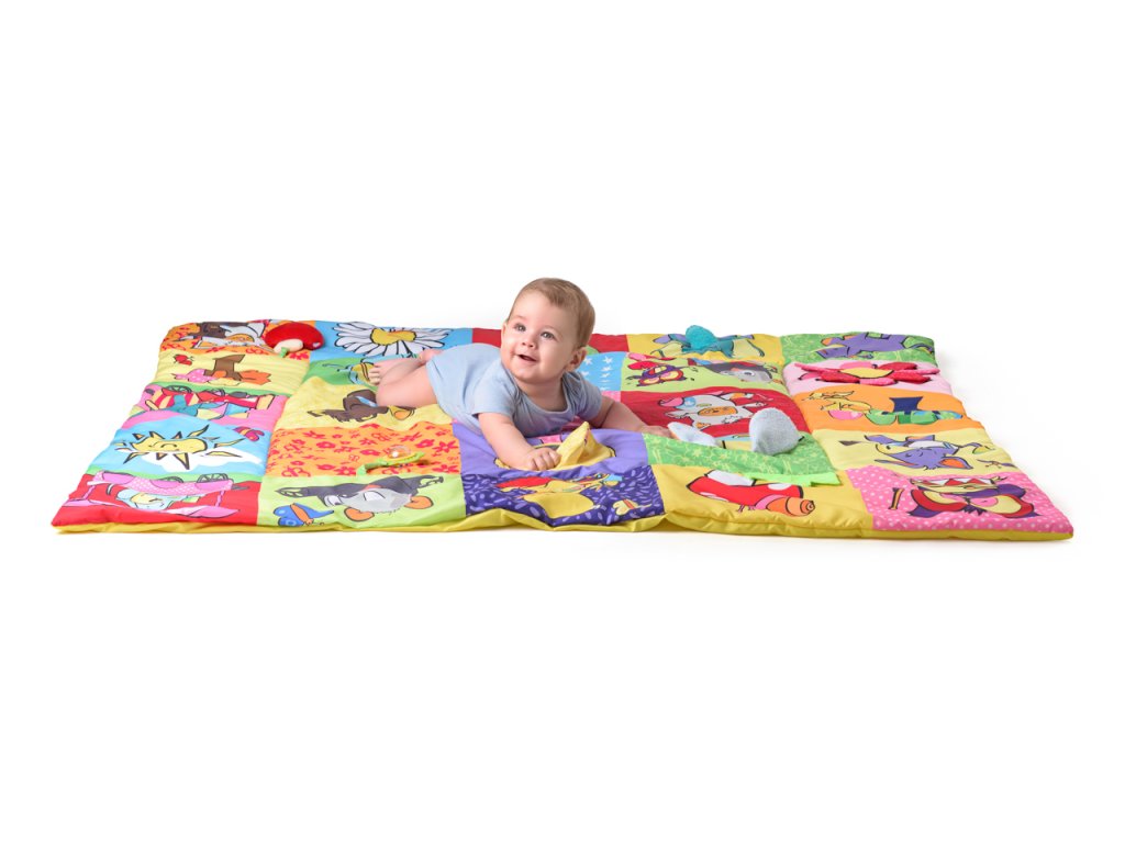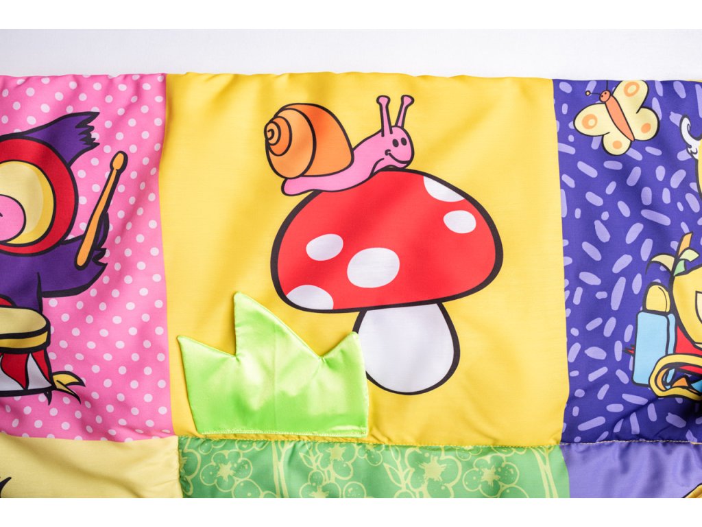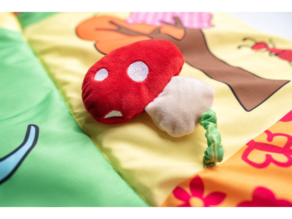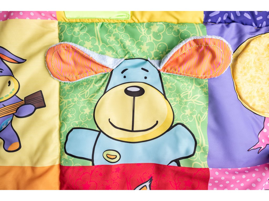 Prostorná hrací deka ve stylu patchwork nabízí mnoho hracích aktivit, které jsou zakomponovány do jednotlivých obrázků. Okvětní lístky, uši pejska, ocásek kočičky i zelený trs travičky vydávají po promnutí zvuk šustícího papíru. Chobot slona a mochomůrka mají zabudované pískátko. Okvětní lístky zeleného chrastítka ve tvaru kytičky jsou zároveň i kousátkem. Když odklopíte korunu zlutého stromu odhalíte bezpečnostní zrcátko, ve kterém dítě uvidí svůj obličej a bude na něj s nadšením reagovat. Věk: 0+. Rozměr: 145 x 145 cm. Video: https://www.youtube.com/watch?v=3IKPGRhapAA