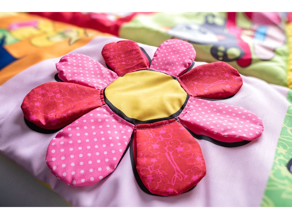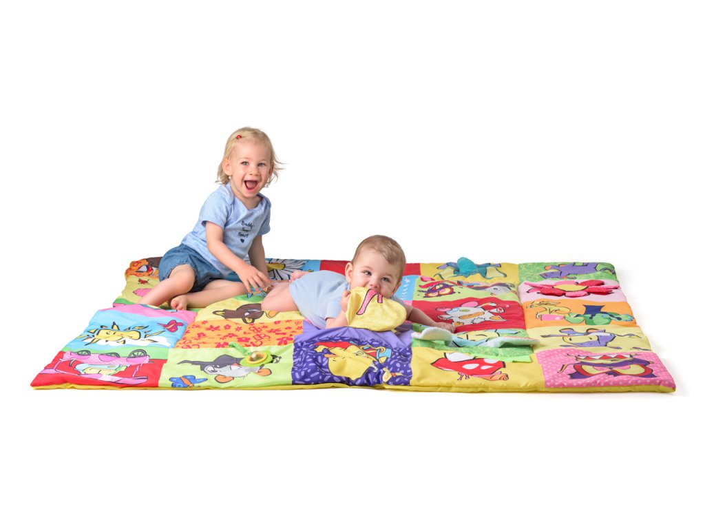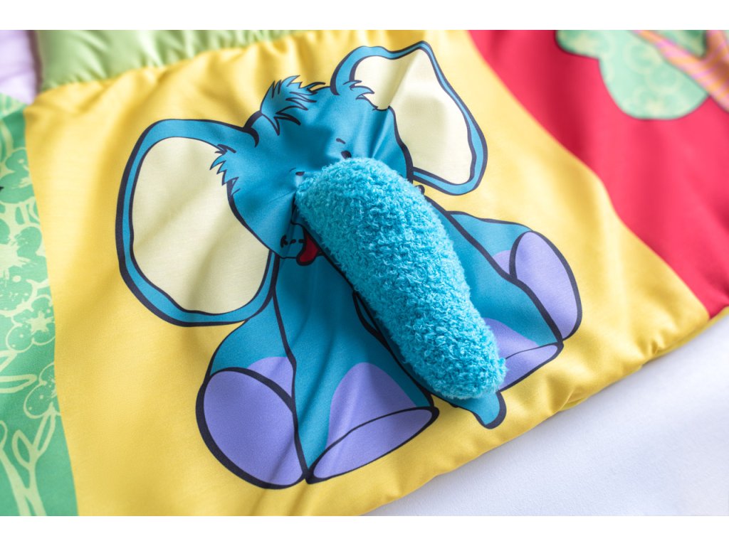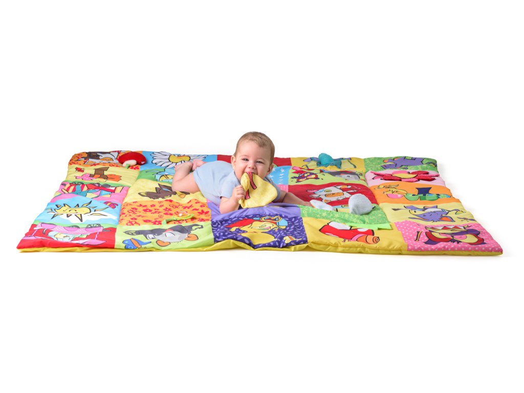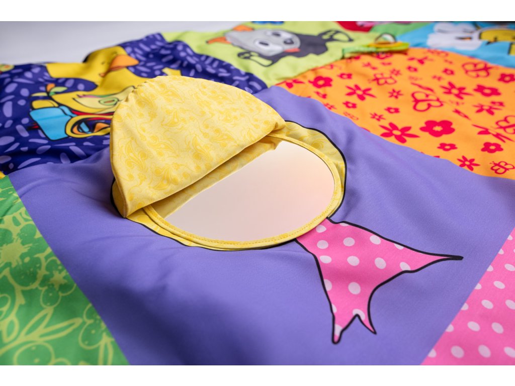 Prostorná hrací deka ve stylu patchwork nabízí mnoho hracích aktivit, které jsou zakomponovány do jednotlivých obrázků. Okvětní lístky, uši pejska, ocásek kočičky i zelený trs travičky vydávají po promnutí zvuk šustícího papíru. Chobot slona a mochomůrka mají zabudované pískátko. Okvětní lístky zeleného chrastítka ve tvaru kytičky jsou zároveň i kousátkem. Když odklopíte korunu zlutého stromu odhalíte bezpečnostní zrcátko, ve kterém dítě uvidí svůj obličej a bude na něj s nadšením reagovat. Věk: 0+. Rozměr: 145 x 145 cm. Video: https://www.youtube.com/watch?v=3IKPGRhapAA
